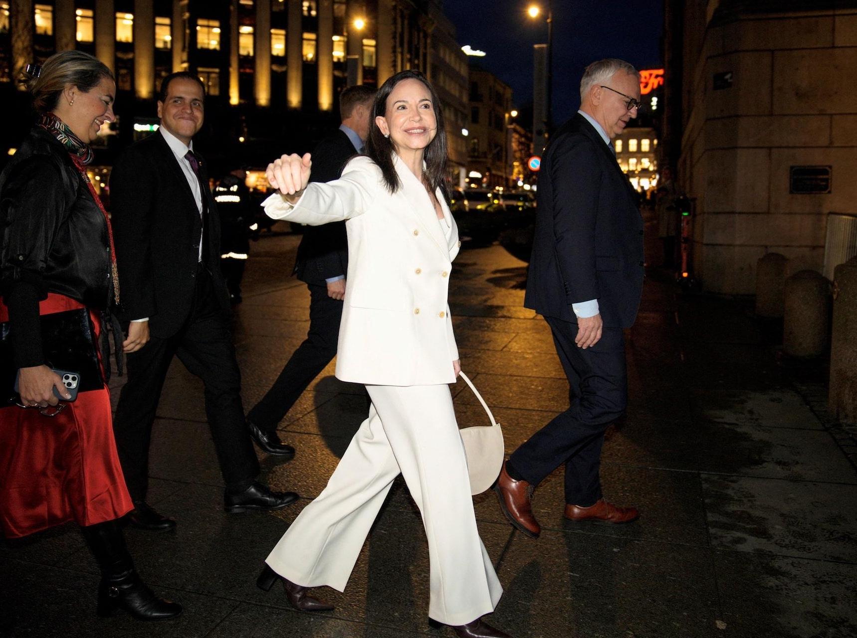 Лидерка оппозиции Венесуэлы появилась в Осло посреди ночи, помахав ликующим сторонникам с балкона Grand Hotel. Она посылала собравшимся воздушные поцелуи и пела вместе с ними. Затем Мачадо вышла на улицу и лично поприветствовала своих сторонников, перелезая через заграждения безопасности, чтобы подойти ближе. Это было первое появление оппозиционерки на публике с января.