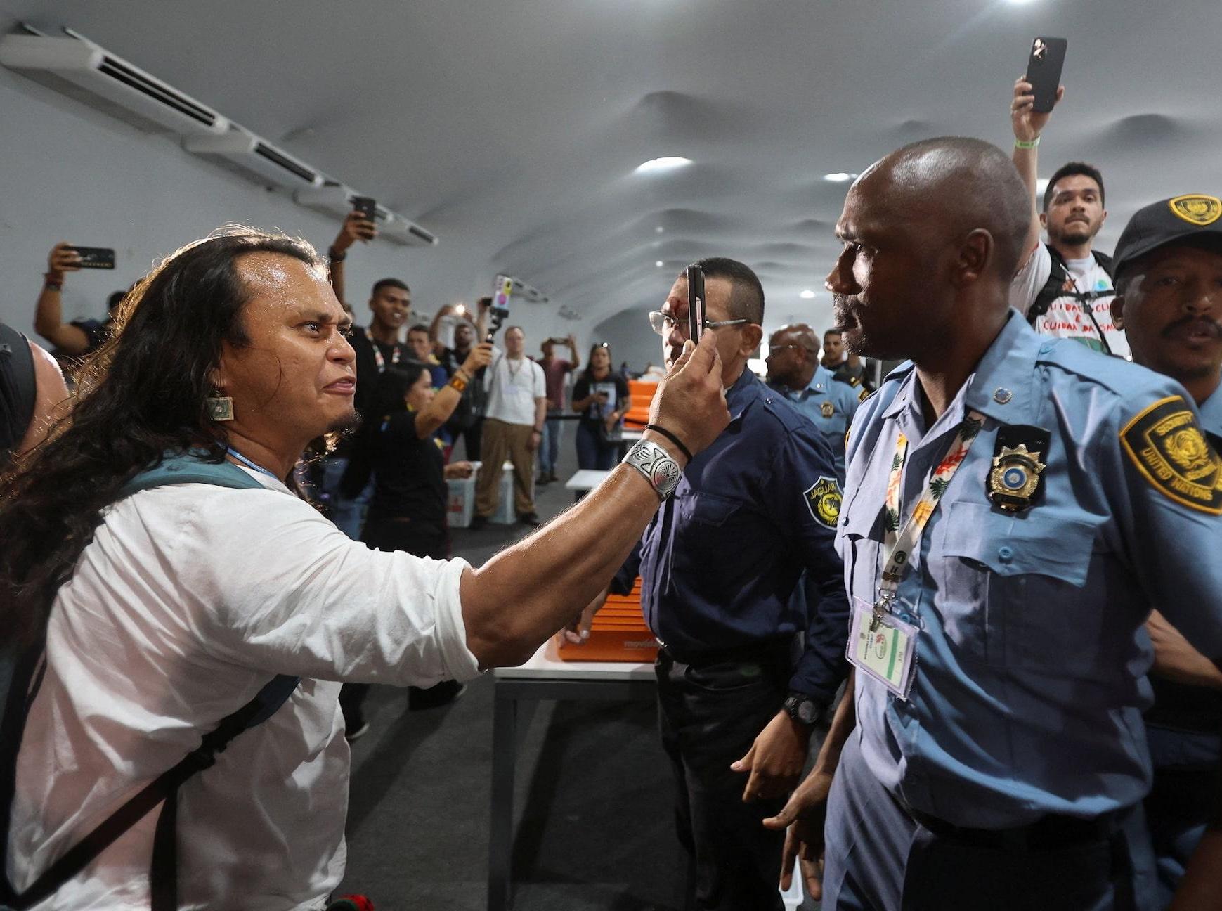 В ООН заявили, что демонстранты пересекли первые заграждения безопасности на месте проведения мероприятия, после чего им не разрешили пройти дальше. Один из охранников рассказал Reuters, что протестующий бросил ему в голову барабан, ударив его по голове. Это крайне необычное нарушение безопасности на конференции, где действуют строгие протоколы.