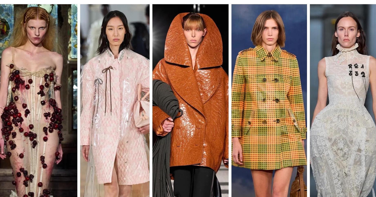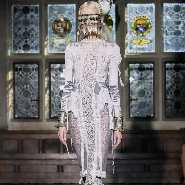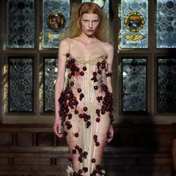 Самым обсуждаемым и желанным событием стала коллекция Дилары Фындыкоглу под названием «Клетка невинности». Шоу выглядело как мистериальная драма. Дизайнер вновь исследовала темы женской уязвимости и силы, превратив их в готический манифест. Силуэты напоминали одновременно средневековые наряды и деконструированные корсеты соблазнительных ведьм, в которых прозрачность тканей соседствовала с агрессивными деталями. Мы уже писали, что среди образов особенно выделялось кремовое платье с силиконовыми вишнями — остроумная игра на грани невинности и эротики. Модели шли босиком, создавая атмосферу обряда, а детали, вроде пряжек в стиле упряжек и ручной вышивки, придавали коллекции архаическую глубину. Фындыкоглу сумела поженить эстетику готики с острым социальным высказыванием, что еще раз закрепило за ней репутацию одного из самых радикальных голосов Лондона. Фантазии Александра Маккуина живы! Но теперь в контексте актуальной фем-повестки.