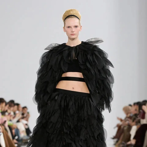 Мадам де Помпадур у Max Mara оказалась в приятной креативной компании. На мудборде коллекции рядом с ее портретами оказались образы Дэвида Боуи и фотографии самого Гриффитса в наряде, сшитом им в 1980 году. Дизайнер провел параллель между рококо и эстетикой нью-романтик — двумя эпохами, когда мода становилась способом побега от реальности и инструментом самовыражения. К примеру, показ открыл тренч без рукавов с «коронами» из задрапированной органзы на плечах и строгого брючного костюма — именно так дизайнер выстроил диалог между XVIII и XX веком. В коллекции было много открытых талий, подчеркнутых тонкими черными ремнями-резинками — намек и на балет или лаконичную фантазию на тему корсета. Отличный стайлинг-прием, который можно повторить. Похожим образом работает длинное приталенное платье с воланами и комплект с открытой талией, украшенный черными шелковыми лепестками.