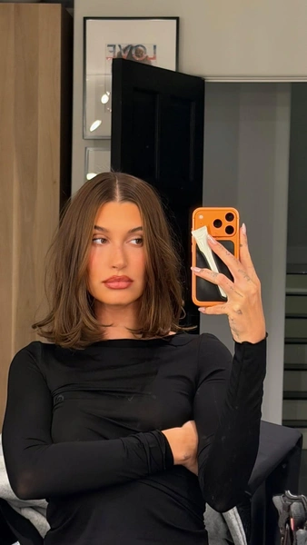 Зимний образ Хейли дополняют глубокие каштановые оттенки и слегка подкрученные кончики в духе 1960-х — минимализм, который смотрится дорого и актуально. Получилось бьюти-обновление без радикальных решений, идеально подходящее для конца года и начала нового.