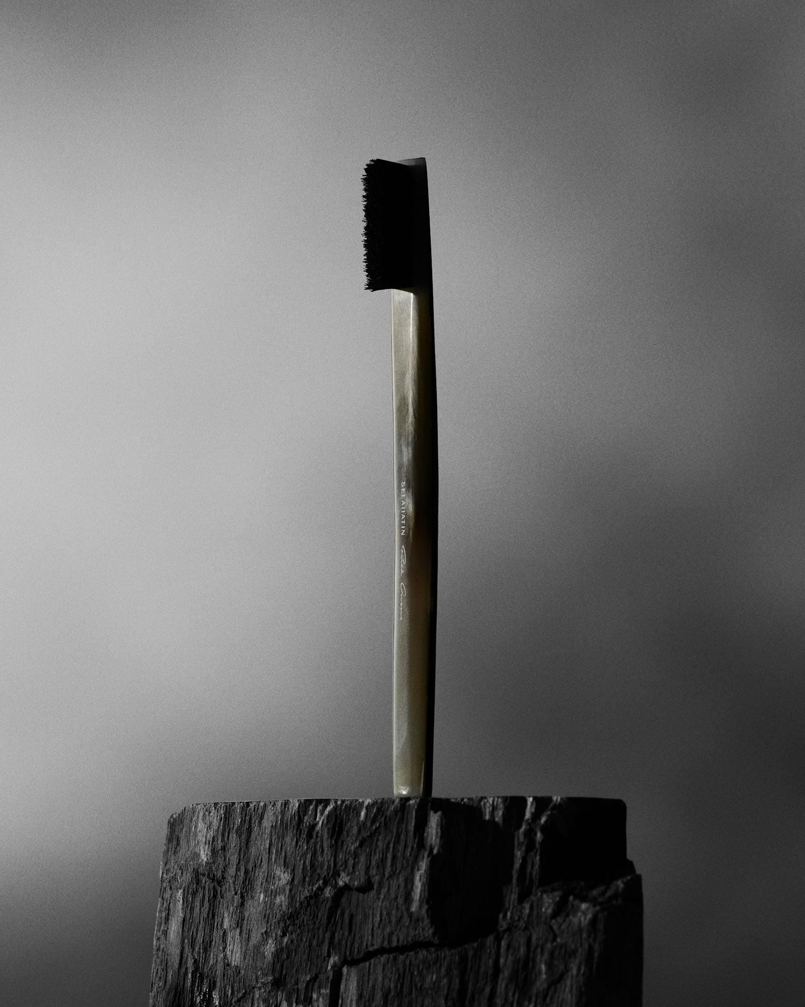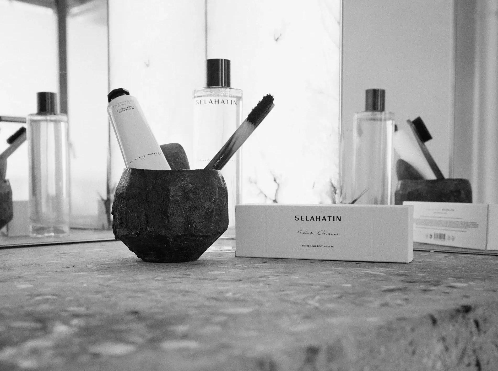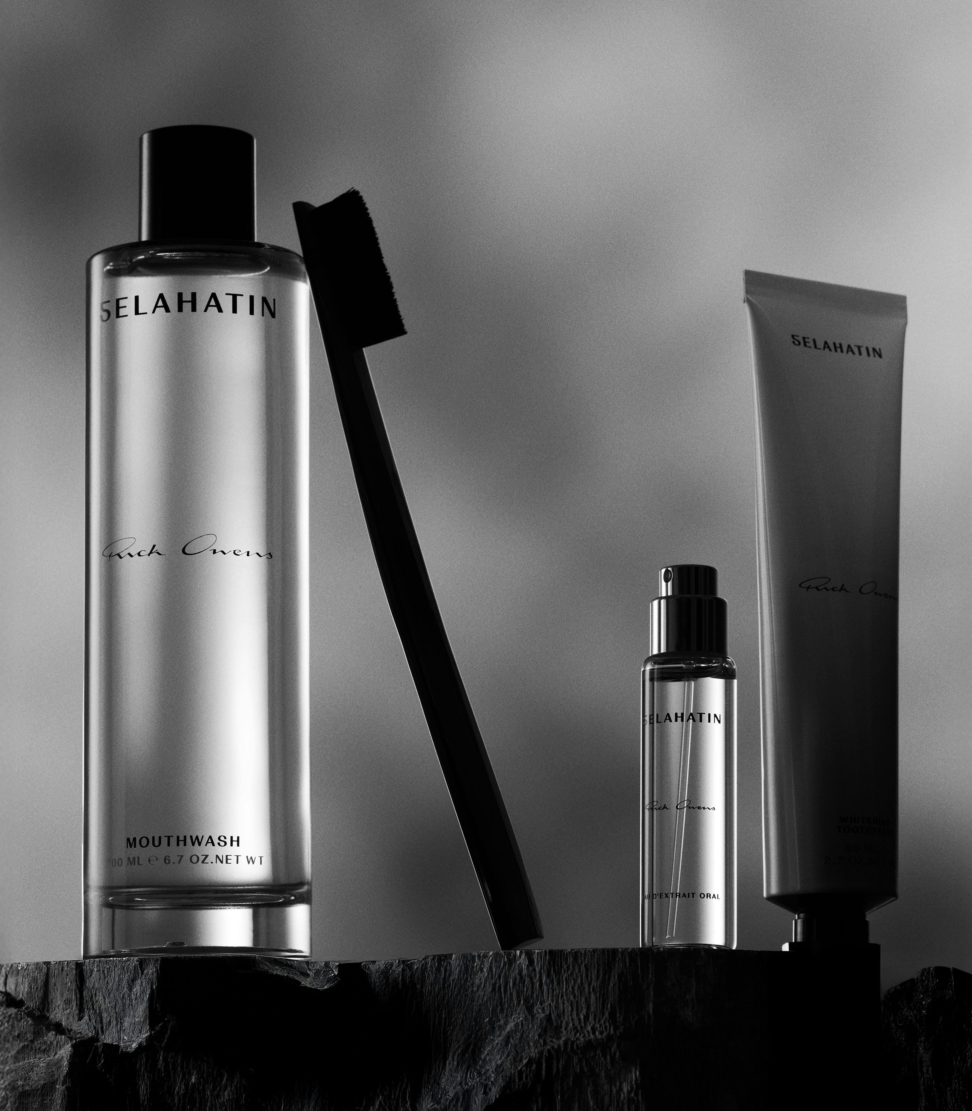 Коллекция включает отбеливающую зубную пасту, ополаскиватель, концентрированный спрей для полости рта и — главное — ручную зубную щетку из рога буйвола. Все выполнено в духе Рика: строго, почти брутально, с чувственной тактильностью и ощущением сложного ритуала, а не просто ежедневной обязанности.