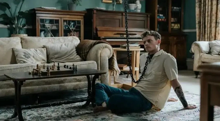 Что именно это за план и зачем им понадобился именно Томми — фильм объясняет неохотно. Отец семейства, Крис, появляется в кадре в нелепом парике и больших очках, говорит тихо и рассудительно, действует методично и взвешенно. Он показывает пленнику мотивационные видео и успокаивавшую музыку, включает записи со зверскими выходками в TikTok и монтирует на потолке систему желобов, по которым Томми в своем ошейнике может в последствии перемещаться по дому — знак того, что его считают достаточно «выдрессированным» для расширения территории.
