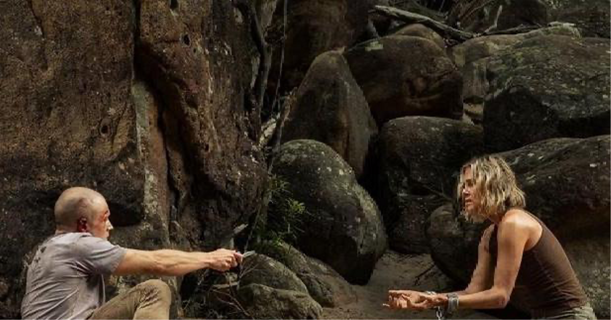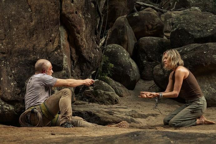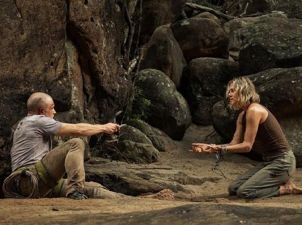 Бен и Саша — оба выкладываются полностью. Та, что должна была стать легкой жертвой, оказывает небывалое сопротивление. Сам Эджертон говорит, что в сценах погони есть нечто детское — первобытная радость преследования, воспоминание о том, как в детстве гоняешься за другими на площадке и не можешь сдержать возбужденный крик. Не будем подробно рассказывать обо всех ловушках, паданиях, травмах и восхождениях. Посмотрим, к чему это все привело. Во-первых, в логово Бена в скалах. Именно здесь открывается полная картина его жизни. Его собственная психология строится на идее слияния с природой. Например, абсолютно жуткий момент, когда Бен достает изо рта протезы и показывает Саше, что