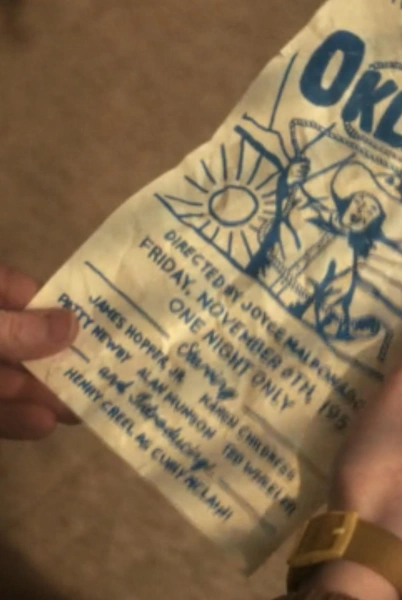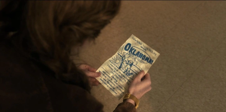 Макс рассказывает Холли о своем «путешествии по задворкам памяти» Генри Крила, пытаясь вырваться из его ментальной тюрьмы. В одном из случайных погружений в прошлое, она попадает в коридоры школы Хоукинса 1959 года. И обнаруживает там нечто, о чем мы никогда не слышали ранее. Юная Джойс Байерс раздает листовки с афишой ее собственной театральной постановкой под названием «Оклахома», зазывая других на представление. Джойс вручает ее проходящему по коридору Харрингтону (будущему отцу Стива), тот, демонстрируя презрение, бросает бумагу на пол. А Макс — поднимает. Она рассказывает Холли, что премьера спектакля «Оклахома» состоялась 6 ноября 1959 года. Десятилетия спустя именно в этот самый день Уилл Байерс исчезнет в лесу и попадет в Изнанку. Но гораздо интереснее в этой листовке другое, о чем Макс умолчала.