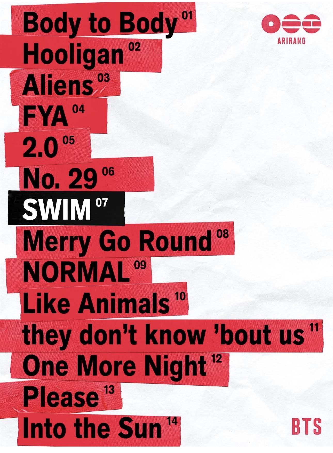Название альбома — Arirang (Ариран) — отсылка к самой известной корейской народной песне, что-то вроде негласного гимна о движении из трудности к чему-то лучшему. Первая известная запись этой мелодии была сделана в США в 1896 году — семью корейскими мужчинами в Университете Говарда. В промо-видео к альбому RM, V, Джин, Чонгук, Чимин, j-hope и Шуга слушают именно ту запись. Сто тридцать лет истории в одном кадре — и осознанное помещение себя в «традицию экспорта корейской культуры». Мотивы Арирана появляются уже на открывающем треке Body To Body, вплавленные в хип-хоп бит с клэппами и тяжелым лоу-эндом.