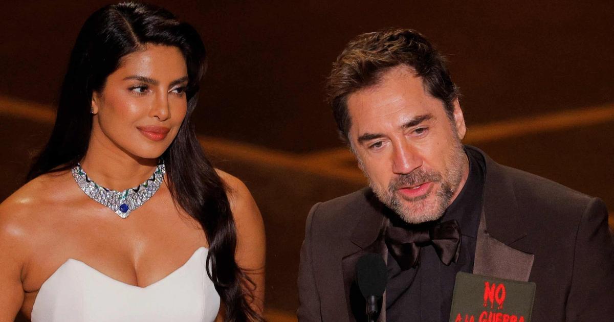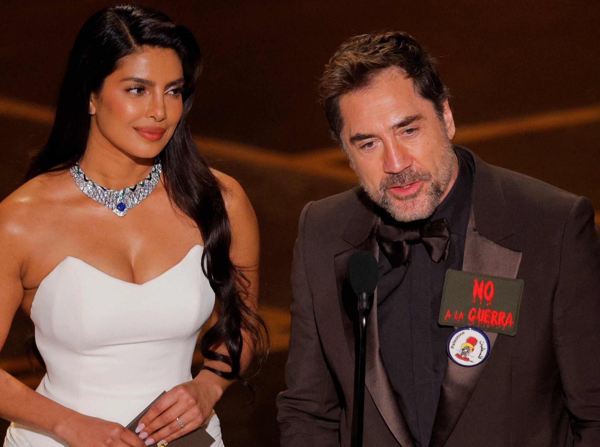 Актер прикрепил к смокингу два значка: на одном была надпись «No a la Guerra», или «Нет войне», а на другом — изображение Хандалы, давнего символа палестинской идентичности и сопротивления.