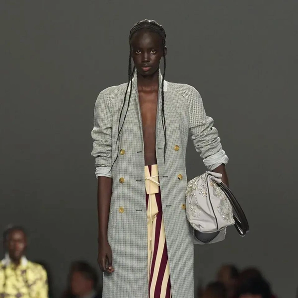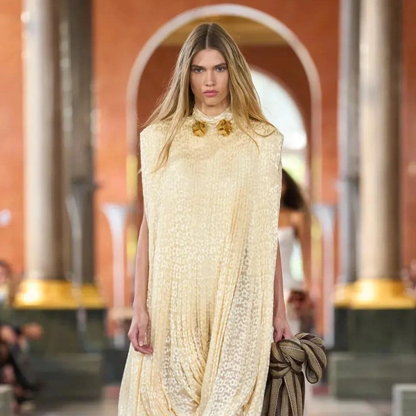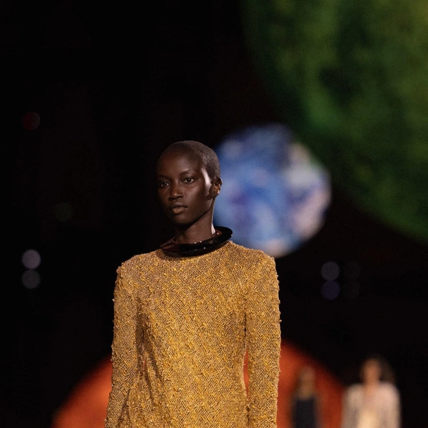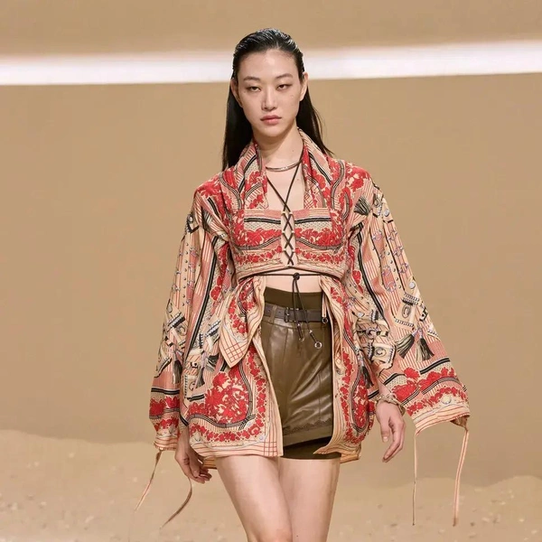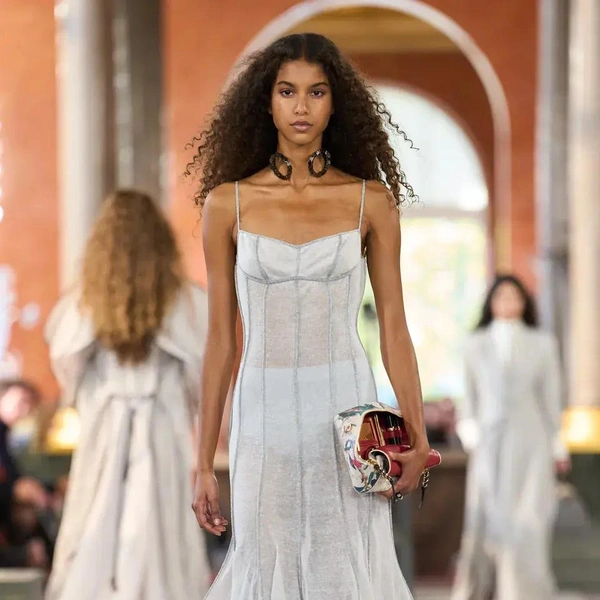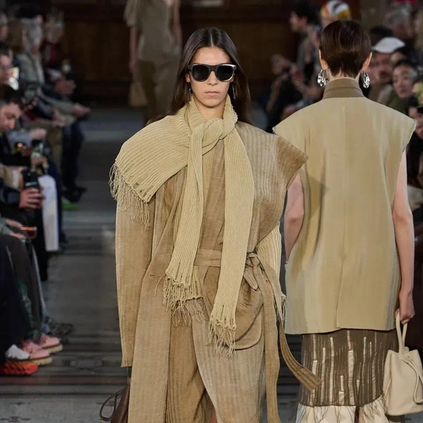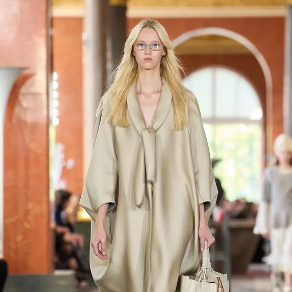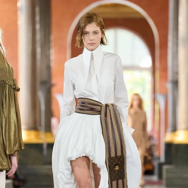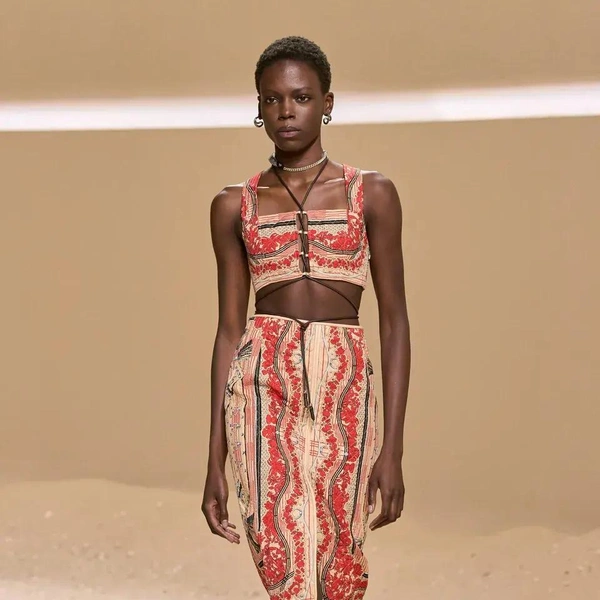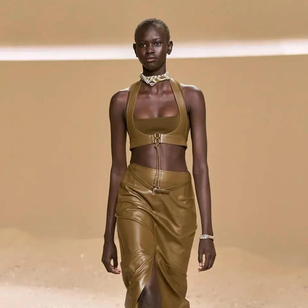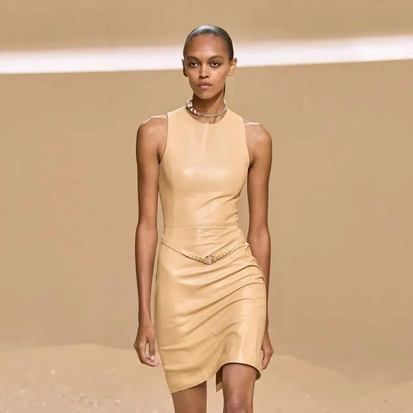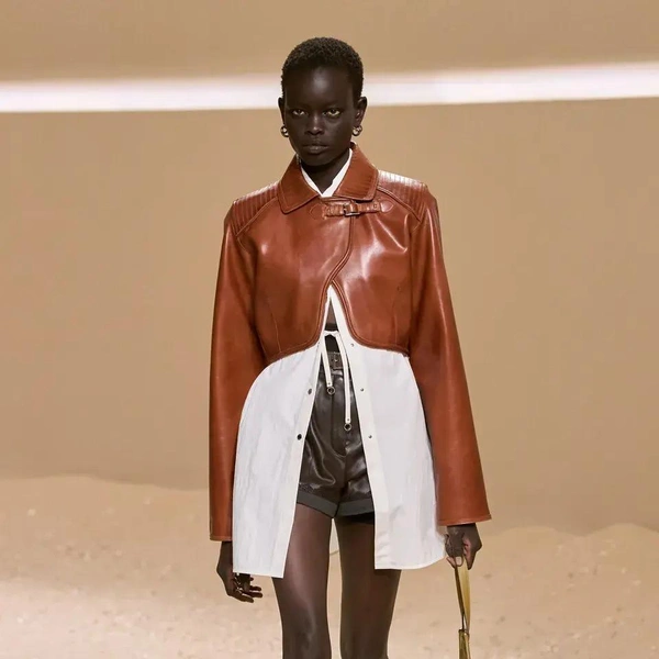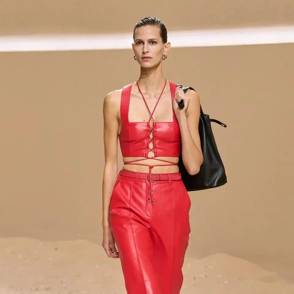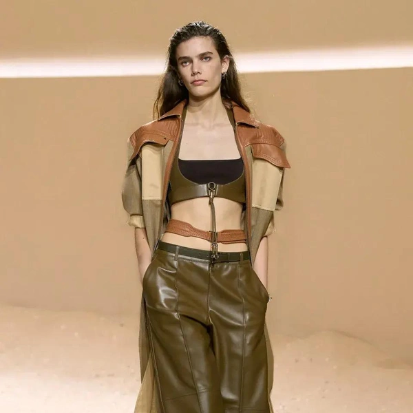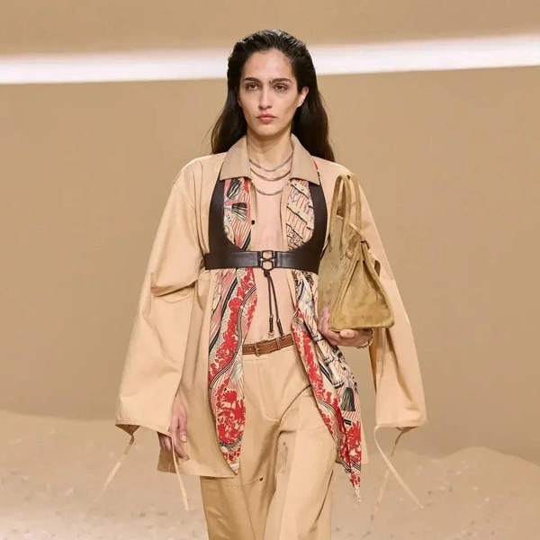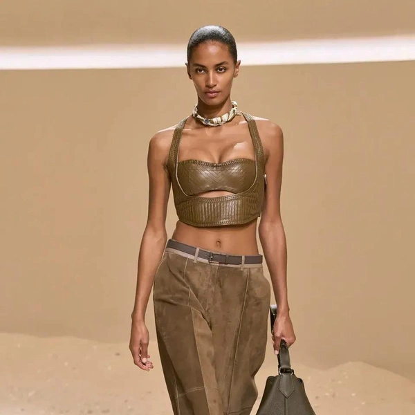 Еще одна талантливая женщина-дизайнер в этой подборке. Надеж Ванье-Сибюльски продолжает вести Hermès по линии тонкого баланса между властью и чувственностью. Показ весна 2026 прошел в пространстве, напоминающем арену для выездки: песчаный подиум, мягкий свет и ощущение тишины перед скачками. В этой атмосфере спортивного ритуала и азарта и родилась коллекция. Основой, предсказуемо, стала кожа — ключевой материал Дома. Корсеты и лифы с ремнями-перепонками, структурированные жакеты, юбки-портфели, топы с вырезами, напоминающими форму седла. Надеж изобретательно трактует конную тему: сбруя, ремни, петли, узды становятся декоративными акцентами, встроенными в архитектуру одежды. Цветовая гамма — почти природная: охра, песок, оливковый, кирпичный и редкие вспышки глубокого красного. Шелковые шарфы-каре — коллекционный предмет Hermès — теперь появляются не только на шее, но и на талии или как топы. Женщина Hermès у Надеж — та, кто ведет, а не следует. А еще — это самая сексуальная (на грани провокации!) коллекция бренда за последние годы. И нам это, определенно, нравится.