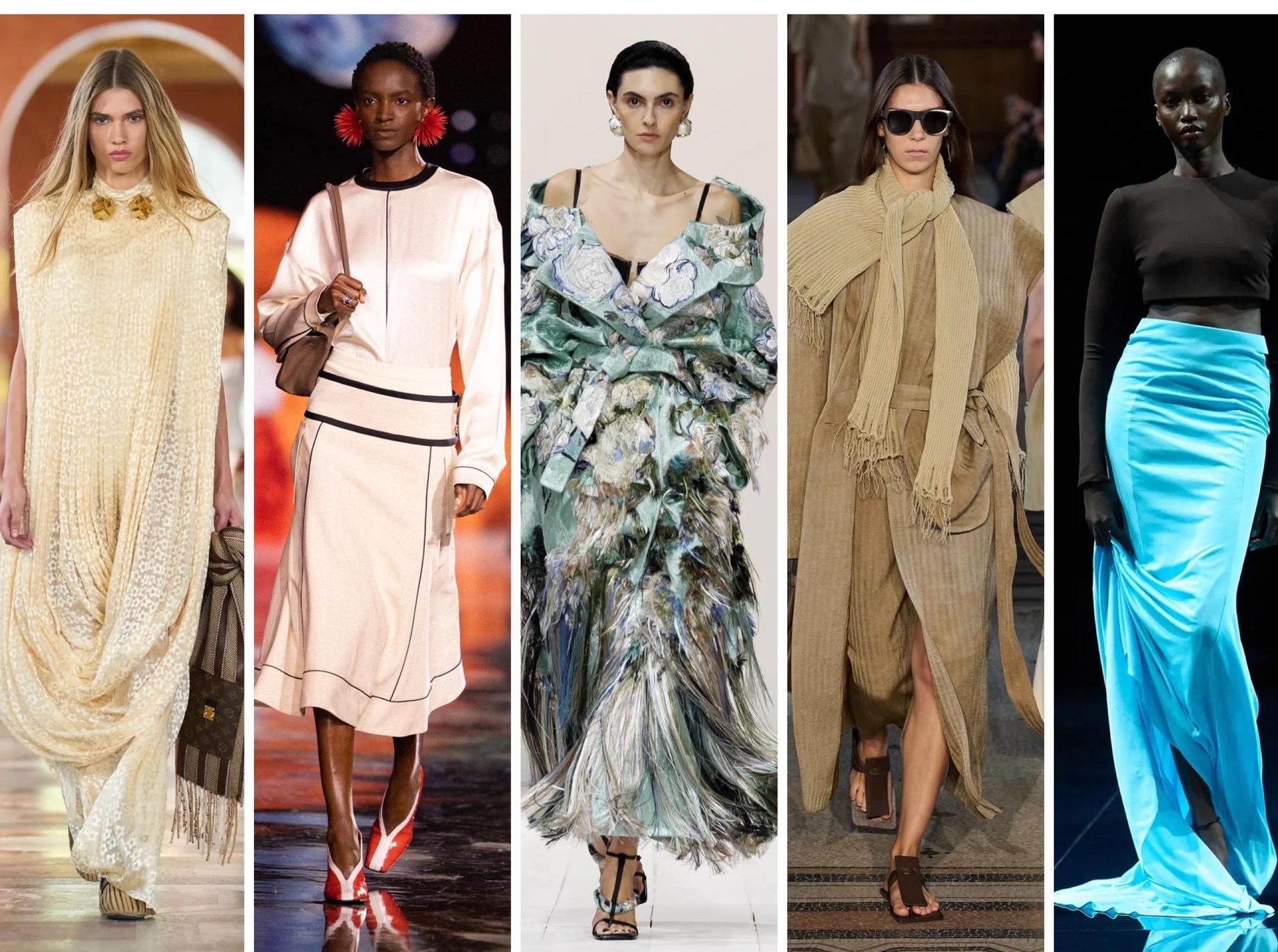 Энтони Ваккарелло — гений чистой красоты. Провальных или просто «слабых» коллекций у него не бывает. И все это — при кажущейся «скудности» набора силуэтов. По сути, в каждом шоу мы видим не более пяти ключевых образов, представленных в разных цветовых вариациях. Но зато какие это образы! В новом показе таких силуэтов было еще меньше — всего три. Но разве можно сказать, что кто-то из гостей ушел «голодным»? Первая часть — кожаные ансамбли-доминанты: узкие юбки-карандаш и приталенные куртки с острыми плечами. Это женщина Saint Laurent в своем рокерском, хищном обличии. Вторая часть — контраст. Воздушные платья-тренчи конца 1970-х из полупрозрачного шифона с драпировками и мягкими линиями плеч. Возвращение к классической женственности и внутренней свободе. Финальный акт — викторианский. Принцессы Saint Laurent выходят в кринолинах бронзовых, песочных и винных оттенков. И тут возникает главный вопрос: какая женщина Saint Laurent — вы?