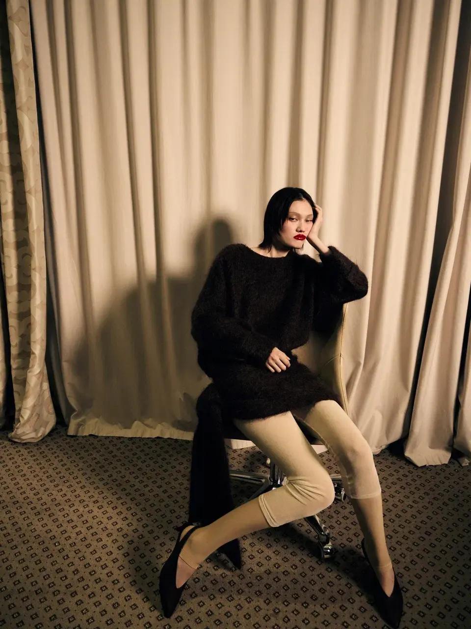 Платье из мохера, Kalmanovich; туфли из кожи, Co; легинсы, Calzedonia; капри из сетки, Gooroo