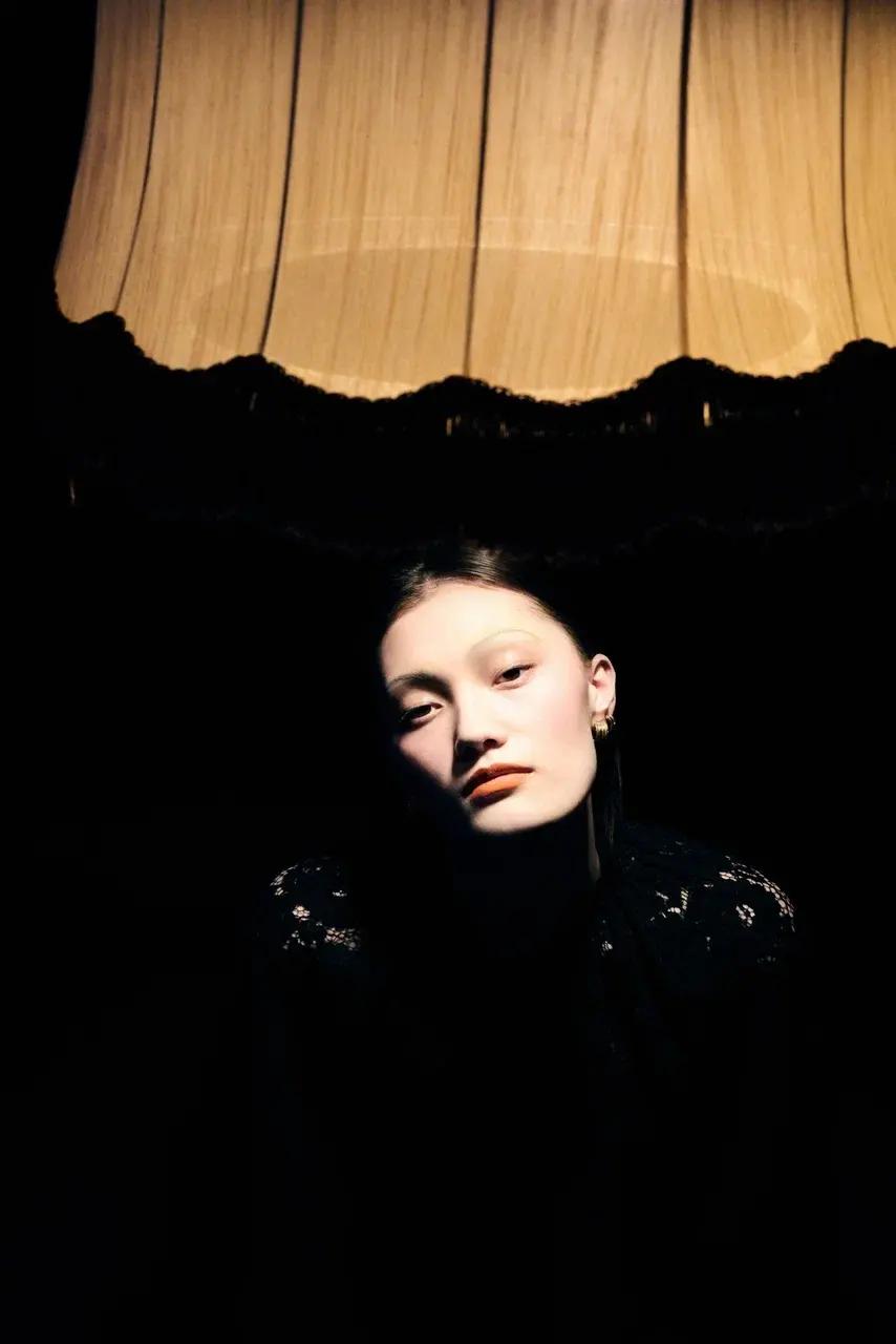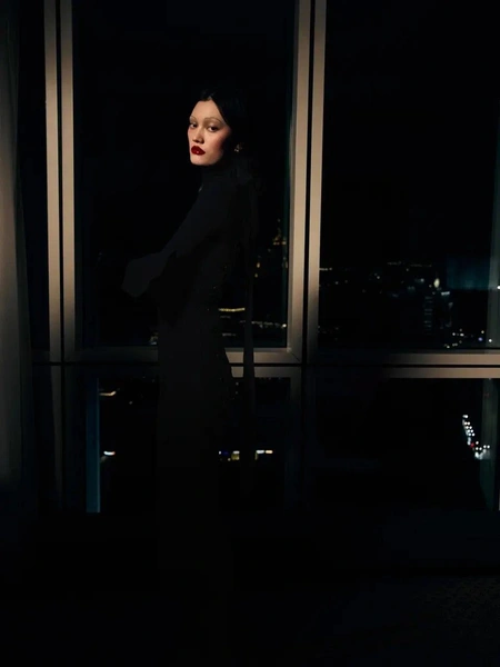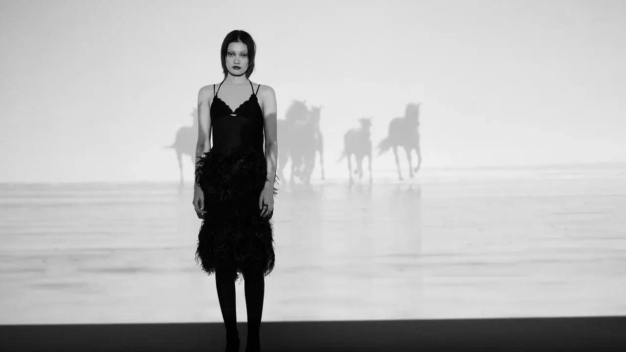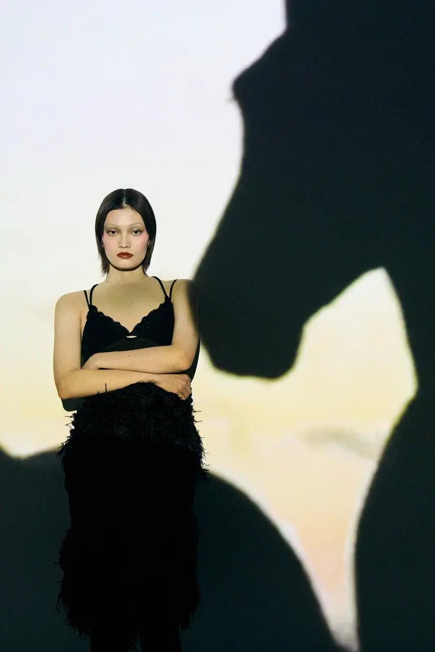 Боди, Blizhe; платье с отделкой из перьев страуса, The Attico; колготки, Falke; кольцо из розового золота и керамики B.zero1, кольцо из белого золота и бриллиантов, Serpenti, все — BVLGARI