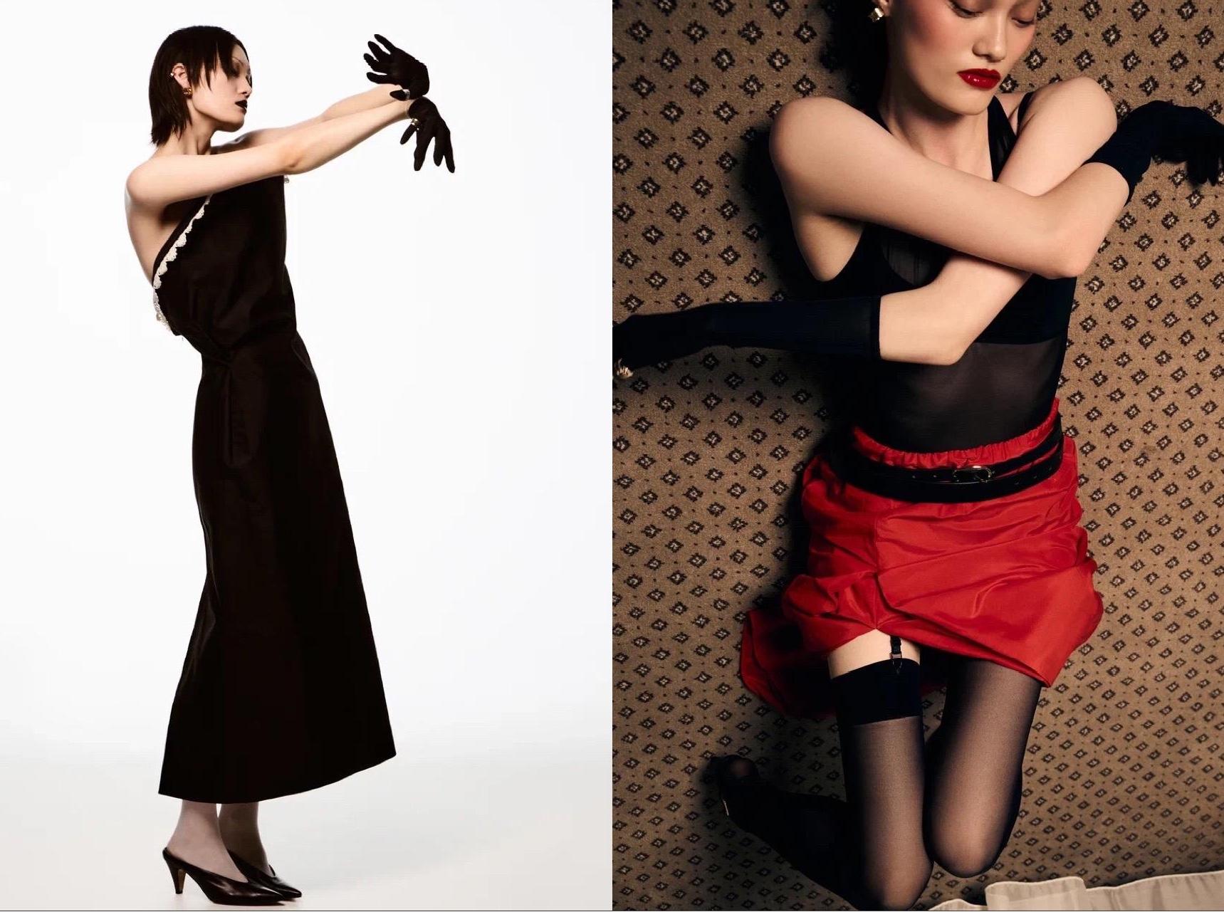 Боди из сетки, пояс и чулки, все — Blizhe; бра из хлопка, Corporelle; юбка, Loulou de Saison, туфли, Sergio Rossi; ремни из кожи сверху вниз: Roseville, Lime; перчатки из сетки, Panfil; серьги из желтого золота B.zero1, кольцо из розового золота и керамики B.zero1, все — BVLGARI