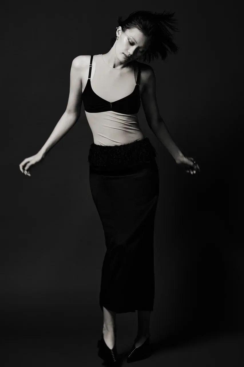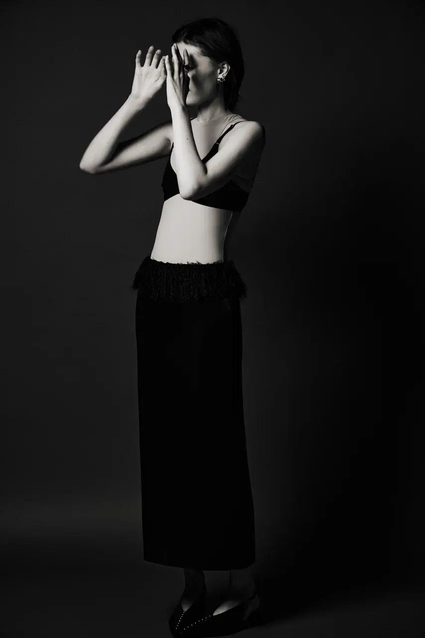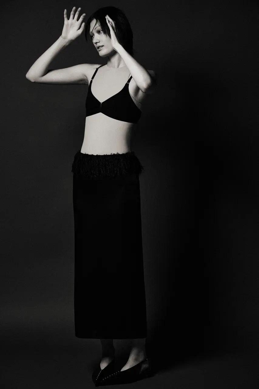 Боди, Blizhe; бра из хлопка, Corporelle; юбка из вискозы и ацетата, Toteme; туфли из кожи Jil Sander; серьги из желтого и розового золота B.zero1, кольцо из розового золота и керамики B.zero1, все — BVLGARI