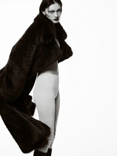 Пальто из искусственного меха, MSGM; топ и капри из сетки, бра из шелка, все — Gooroo; гетры, Ruban; серьги из желтого золота B.zero1, BVLGARI