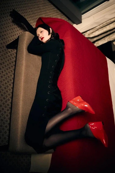 Платье со шнуровкой, Balenciaga, мюли из лакированной кожи, Ferragamo; перчатки из сетки, Panfil; колготки, Falke; серьги из желтого и розового золота B.Zero1, BVLGARI