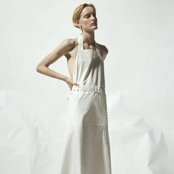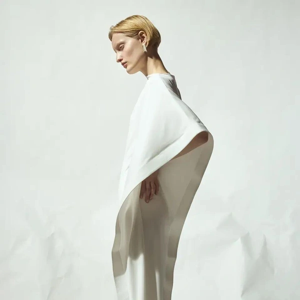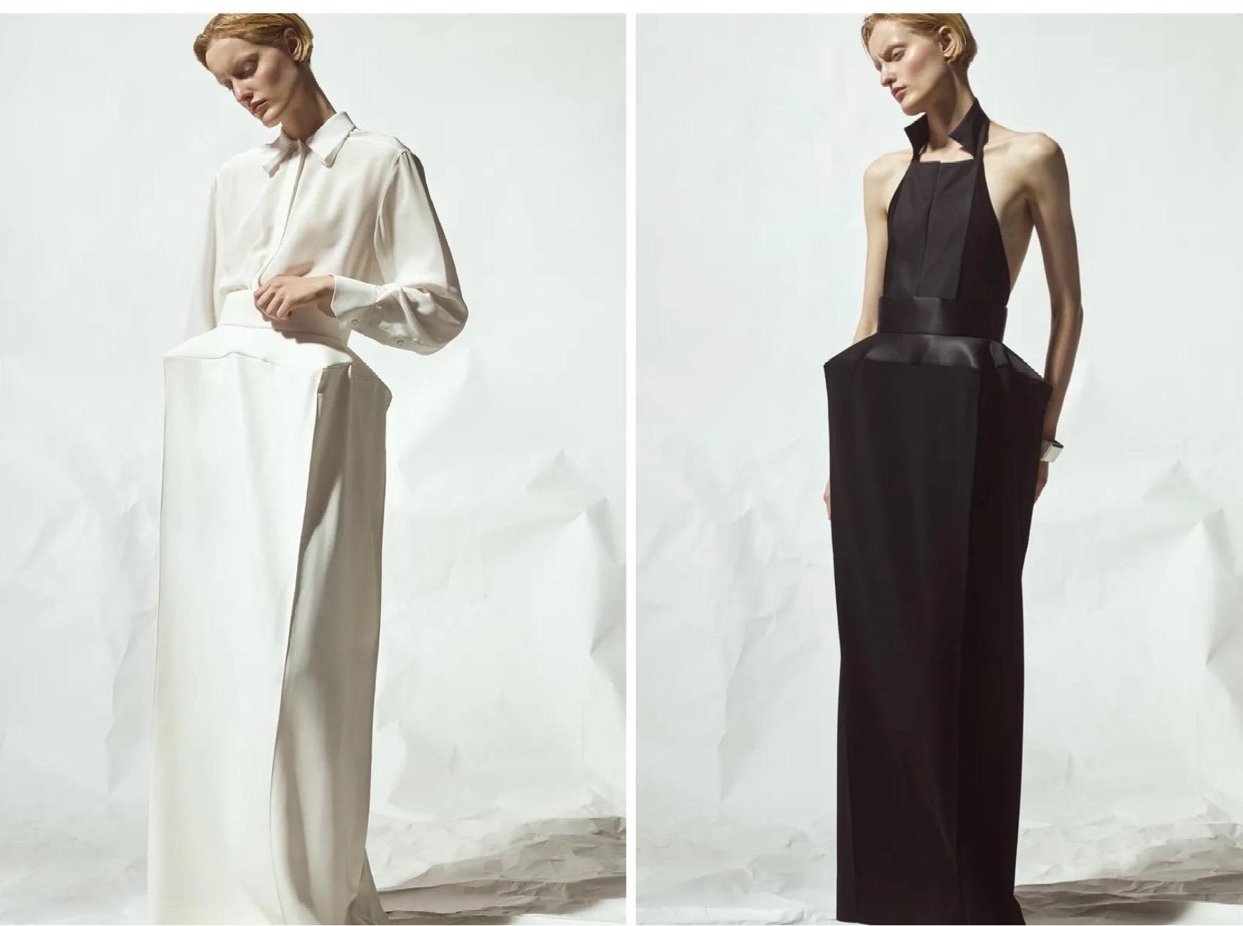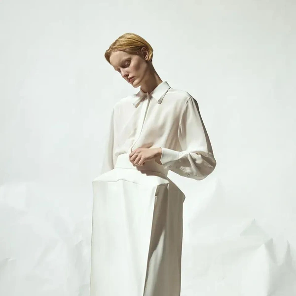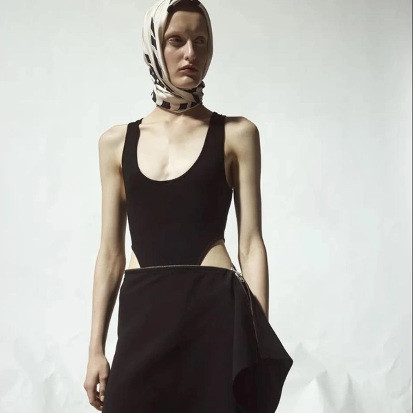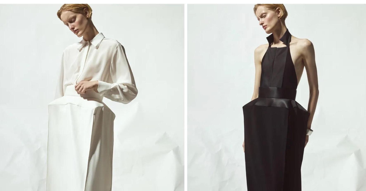 Палитра коллекции подчеркнула этот подход: белый и черный составили основу. В руках Бевзы плотный хлопок, бамбуковый трикотаж и креп превращаются в геометрические топы-квадраты со встроенными молниями и платья со сложной драпировкой. Среди самых выразительных вещей оказались табард и асимметричная юбка, собранные из квадратных панелей с молниями по краям, позволяющими менять степень «открытости».