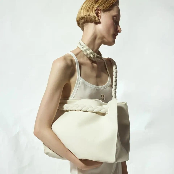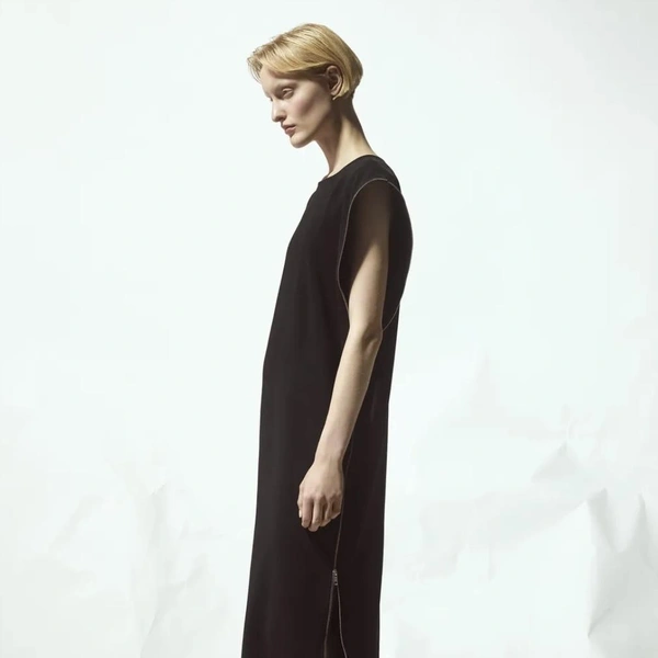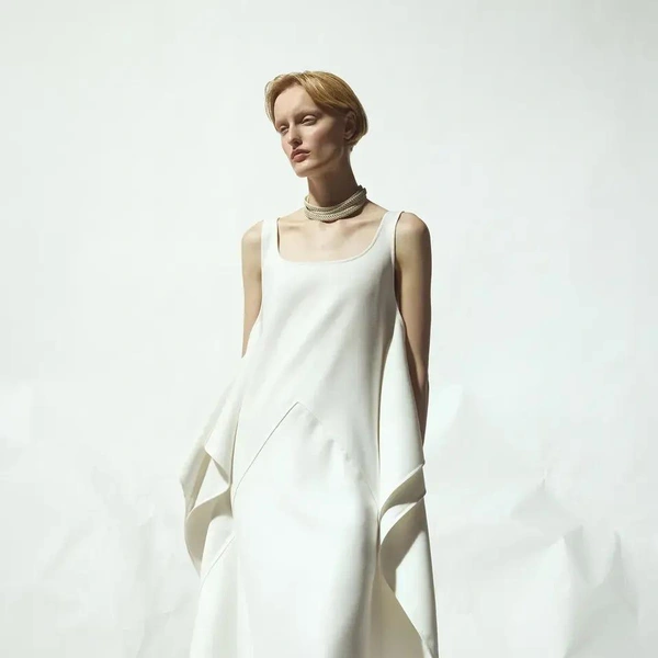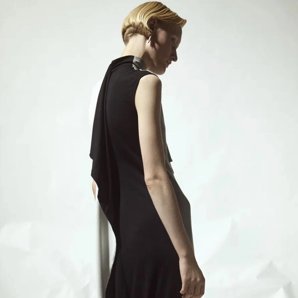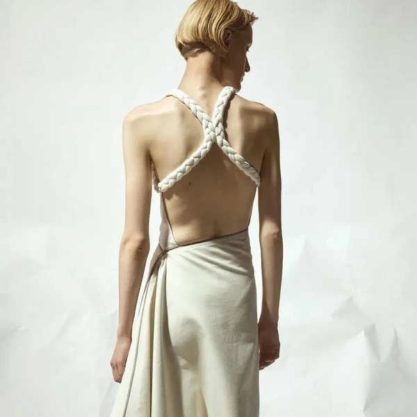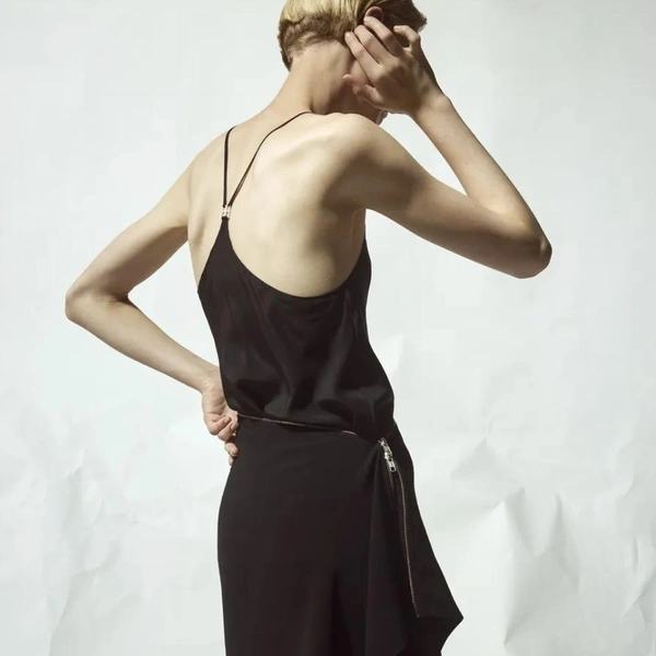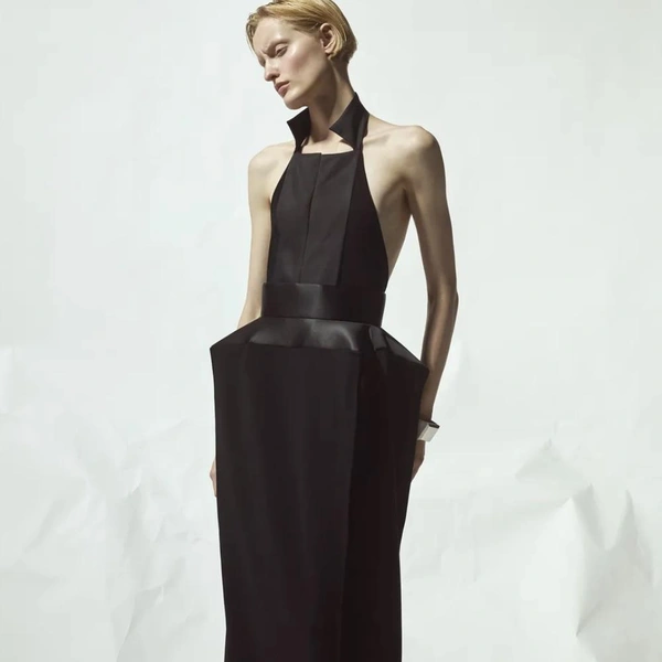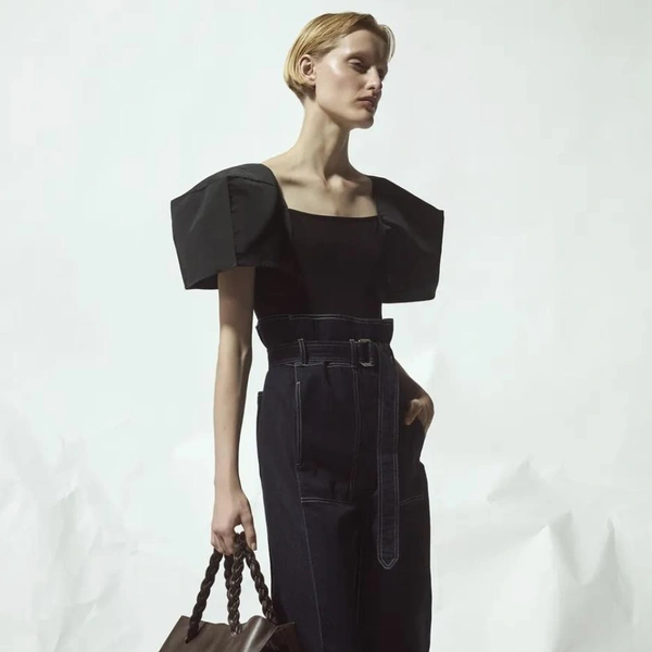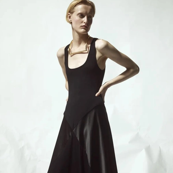 Палитра коллекции подчеркнула этот подход: белый и черный составили основу. В руках Бевзы плотный хлопок, бамбуковый трикотаж и креп превращаются в геометрические топы-квадраты со встроенными молниями и платья со сложной драпировкой. Среди самых выразительных вещей оказались табард и асимметричная юбка, собранные из квадратных панелей с молниями по краям, позволяющими менять степень «открытости».
