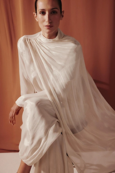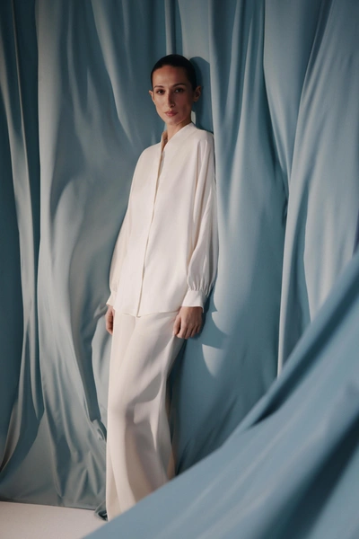 Абсолютный хит новой лимитированной коллекции — комплект из лаконичной блузки с высоким воротником и свободных брюк из шелка серо-голубого оттенка, напоминающий мираж в жаркой пустыне. Этот материал приятно скользит по коже, создавая ощущение легкой прохлады и невесомости. (Комплект также доступен в молочном оттенке). Или другой сет — блузка с палантином, которую можно носить как с брюками-алладинами, так и с длинной юбкой из легкой, полупрозрачной ткани. В материал вплетена тончайшая серебристая нить, благодаря которой ткань завораживающе мерцает. Все вещи удобно стилизовать как для дневных, так и для вечерних выходов.