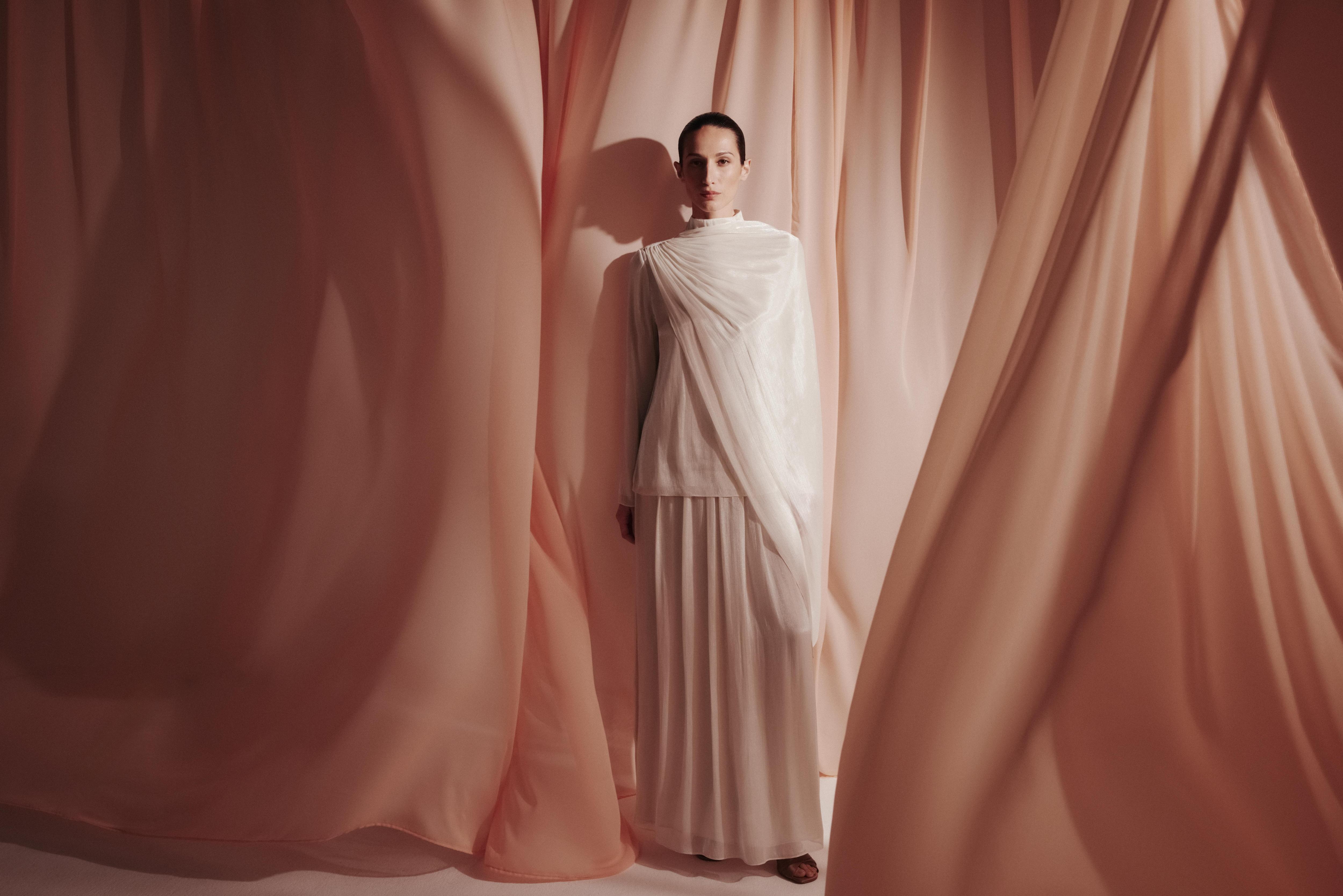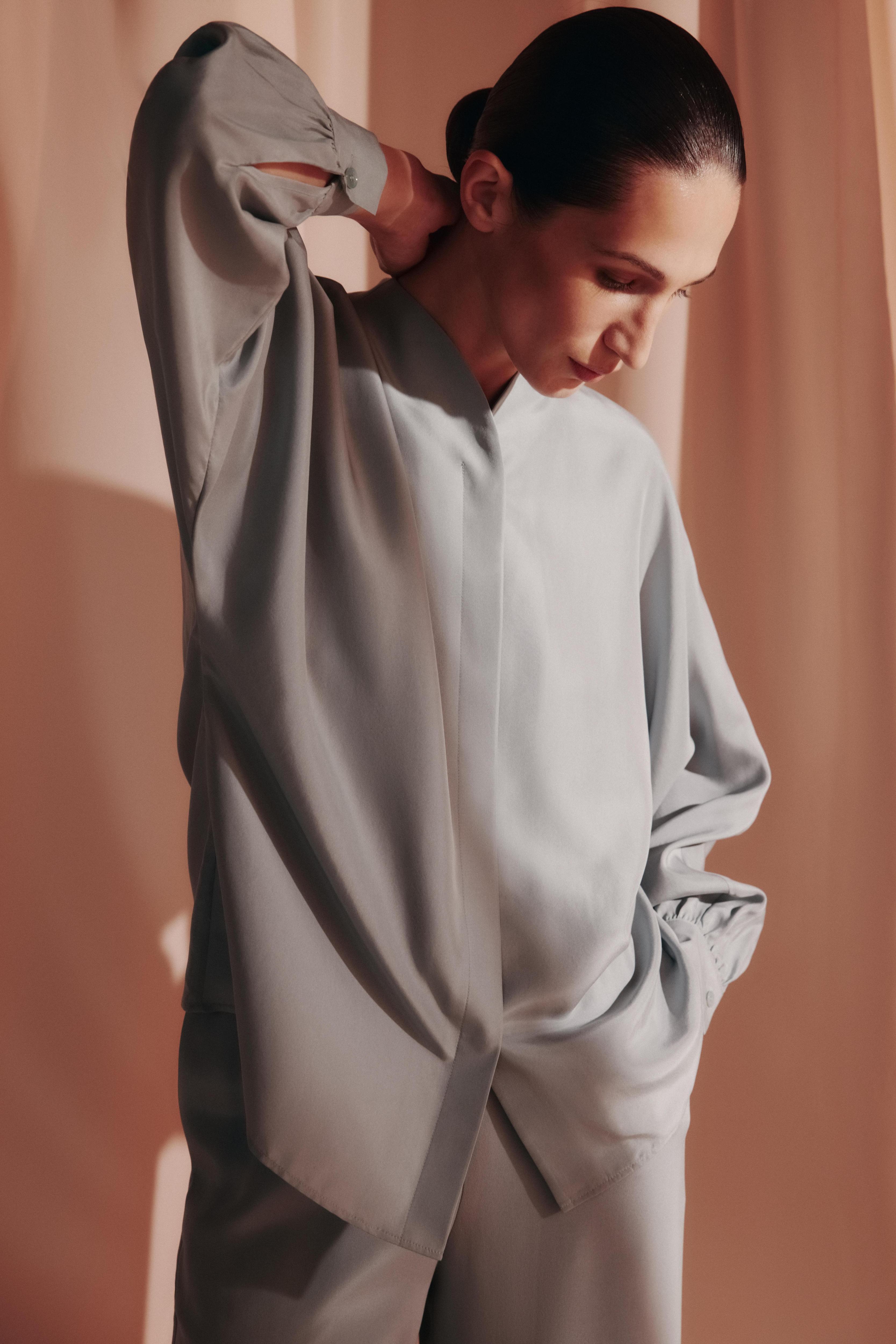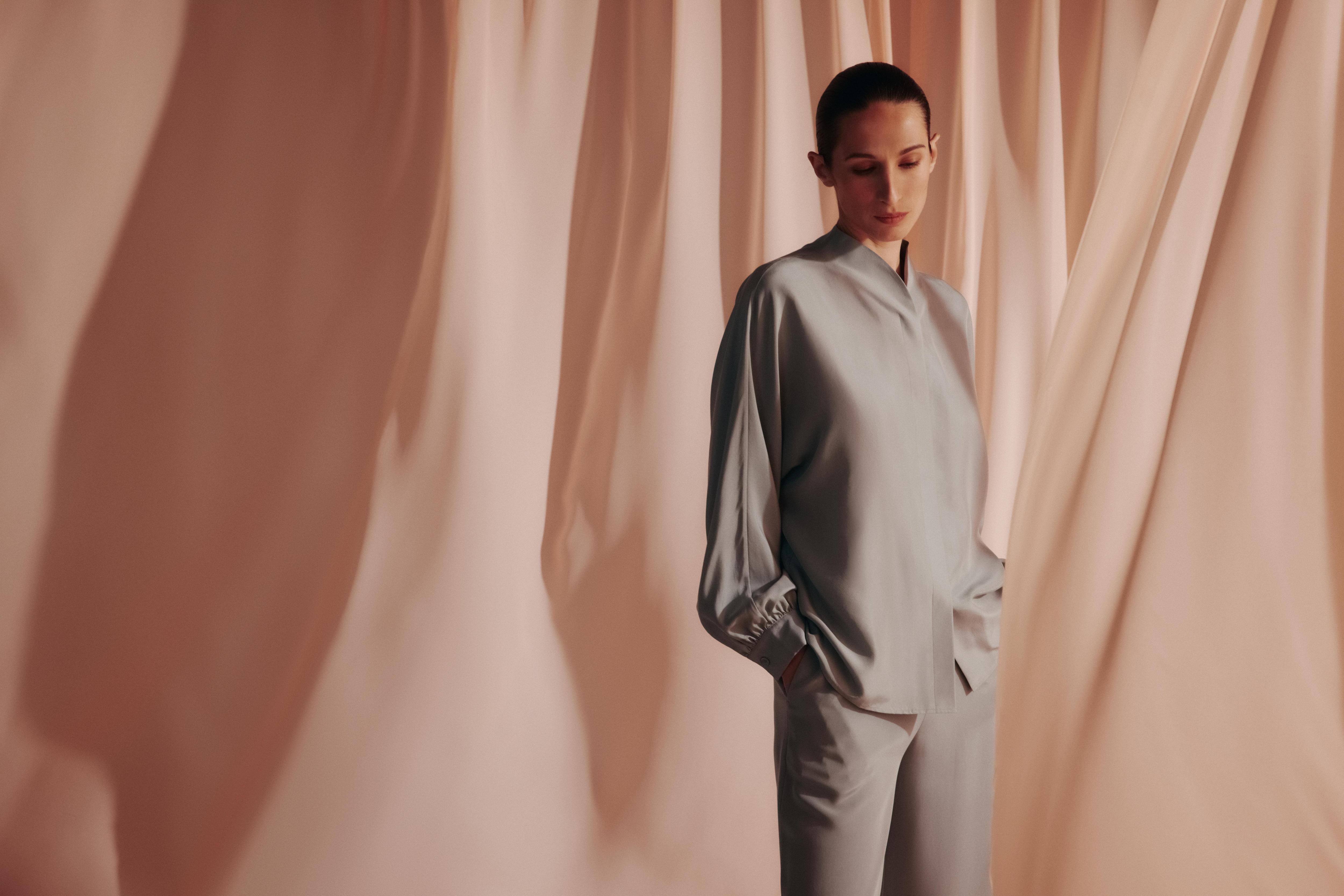 Ключевым решением и находкой команды 12 STOREEZ стал шелк с обработкой по технологии Sand Wash, который команда использует в работе впервые. Ткань проходит многократную промывку в среде с мелкими абразивными частицами: излишний блеск снимается, волокно раскрывается, поверхность становится мягче и пластичнее. В результате шелк приобретает матовый, приглушенный вид и лучше держит форму в движении.