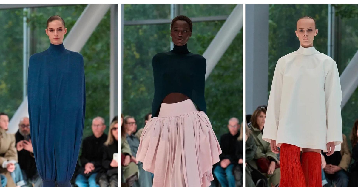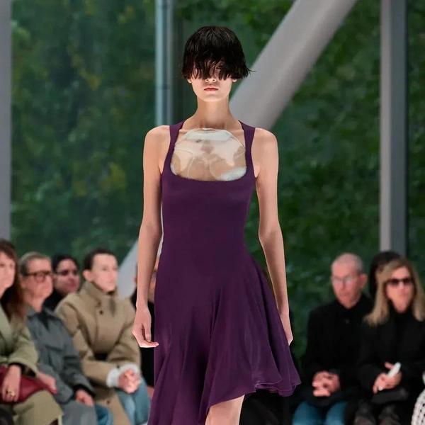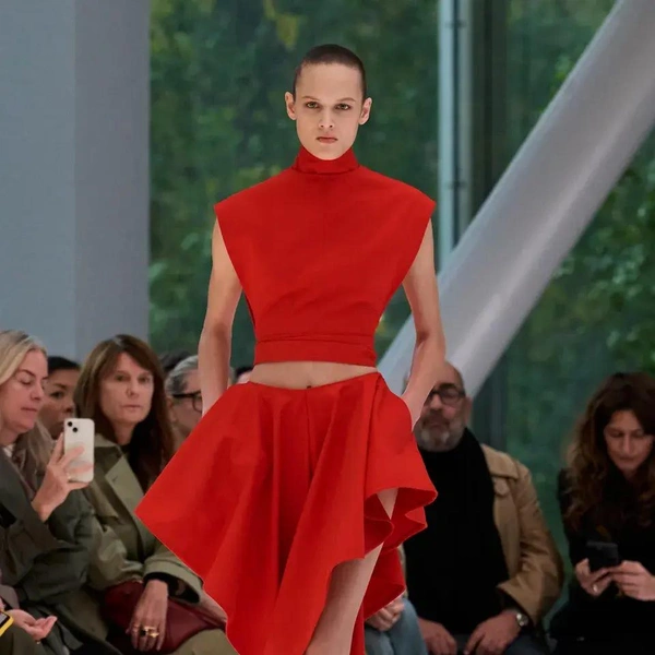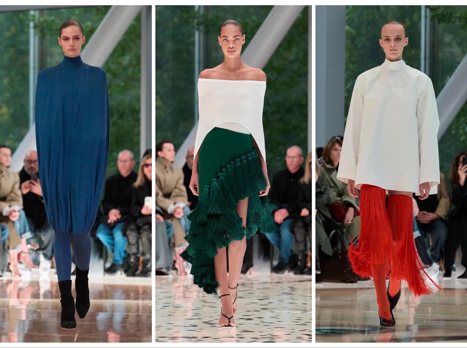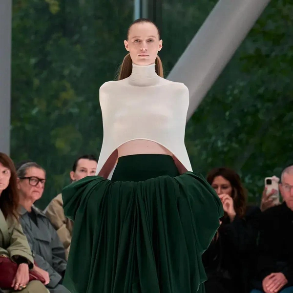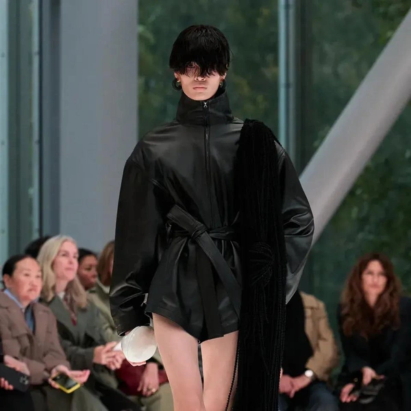 Одним из самых фотографируемых решений стали гибридные силуэты. Юбки-брюки с открытыми боками сочетали в себе строгость и провокацию, а трикотажные свитера-леггинсы без спинки выглядели одновременно интимно и футуристично.