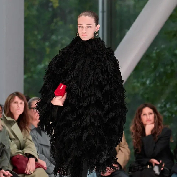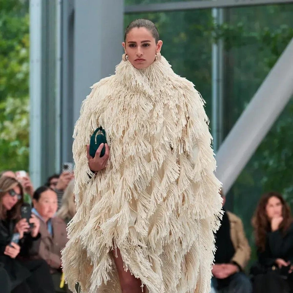 Мюлье превратил бахрому в структурный элемент. Она использовалась не как украшение, а как «строительный материал», из которого создавались массивные пальто и накидки. Многослойные нити драпировались волнами, напоминая движения воды или следы кисти художника.