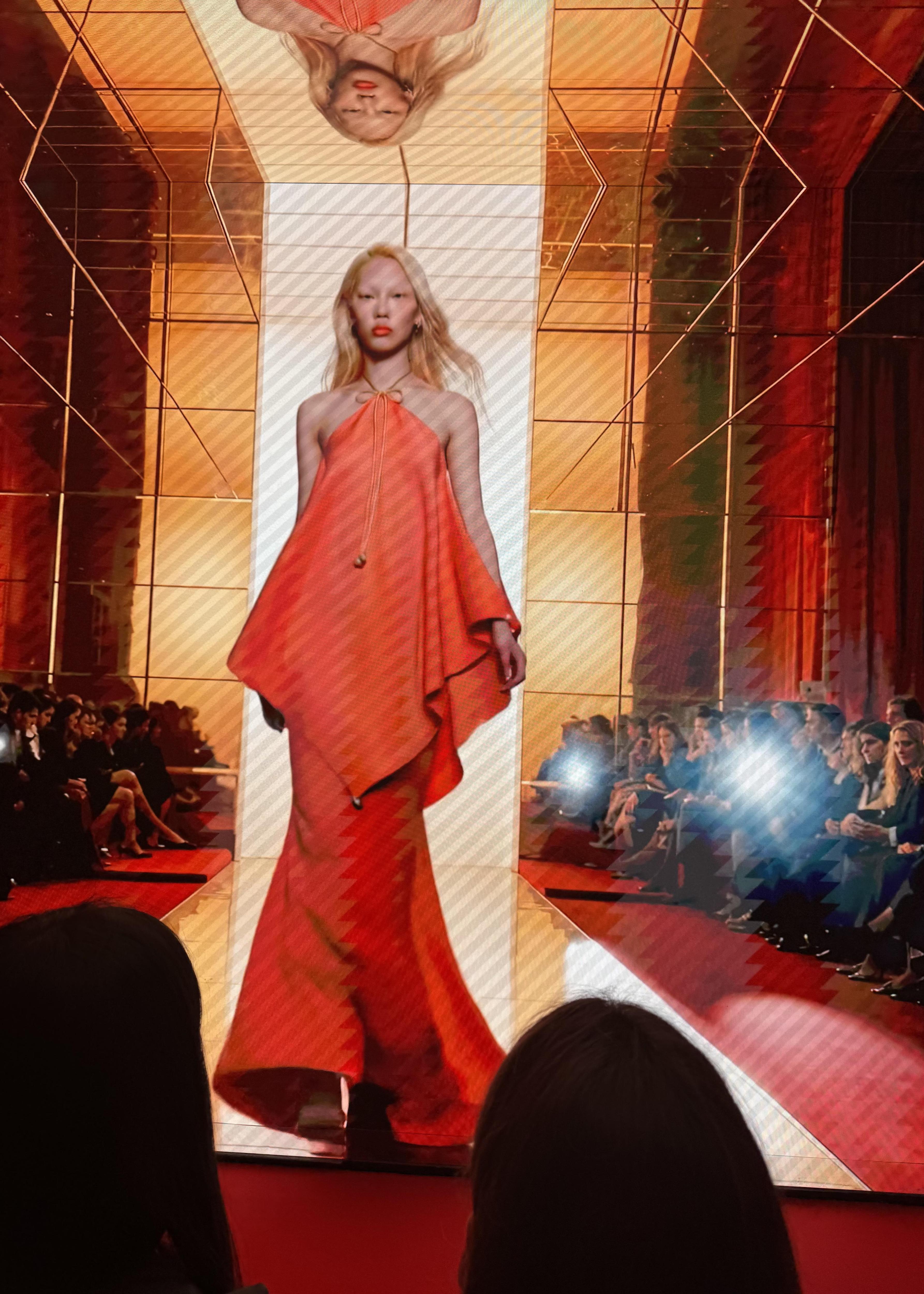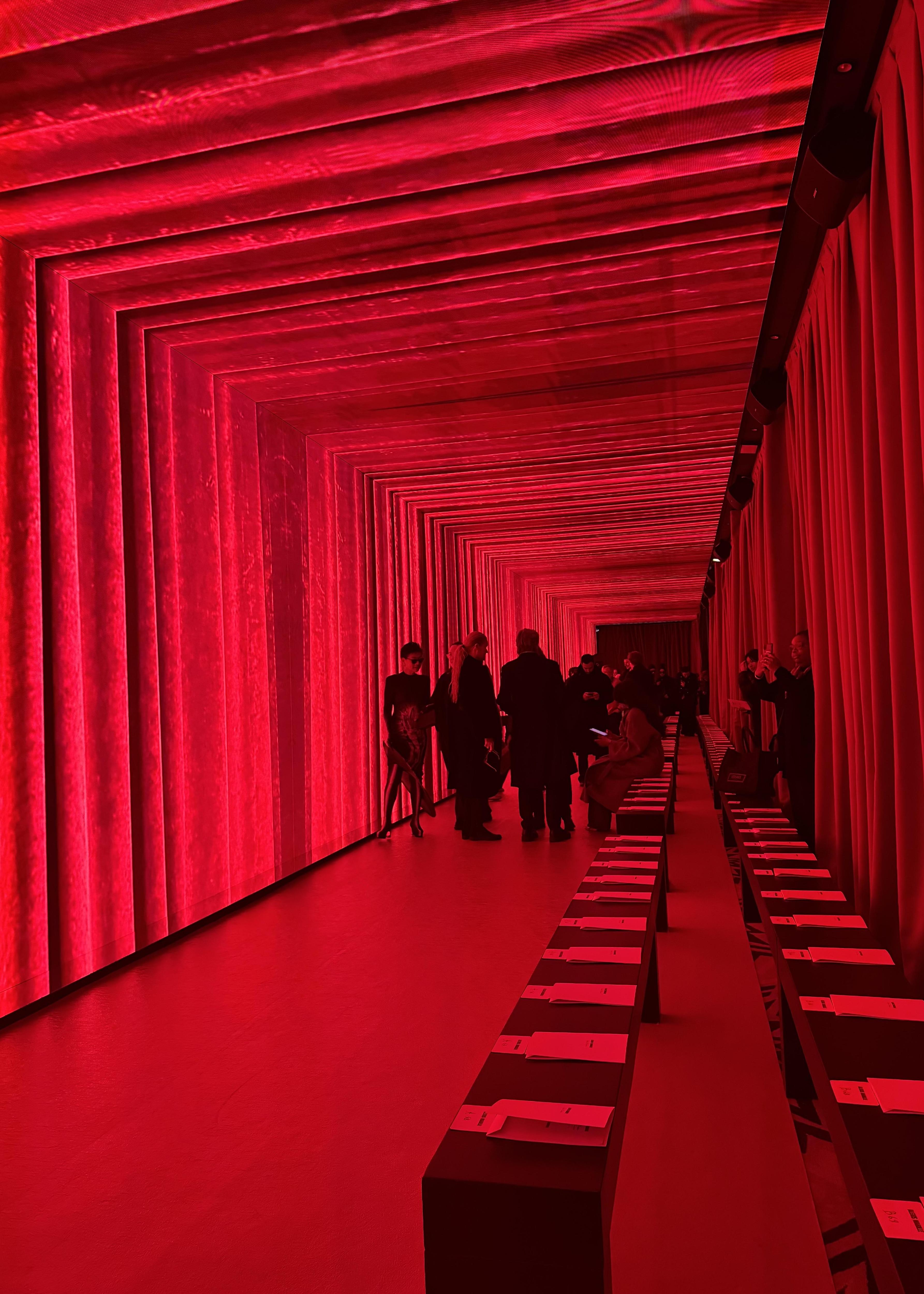 Зрители собрались в зале, напоминающем коридор, затянутый красным бархатом (вайбы Дэвида Линча). Часть пространства была также «затянута» экранами с проекцией тех же красных штор. Любопытно было наблюдать, как все приглашенные держали наготове телефоны, готовясь моментально запечатлеть выход модели. Камеры направлялись то влево, то вправо — гости гадали, с какой стороны появится первая модель на подиуме.