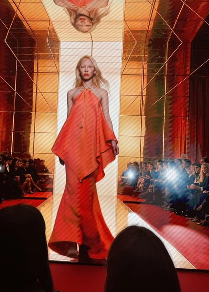 Следом на длинных экранах, протянувшихся вдоль всего подиума, появились такие же ИИ-модели в однотипных цифровых «платьях». При этом качество самой генерации выглядело откровенно проблемным. Лица моделей то «растекались», то «расплывались», пропорции тел не всегда казались реалистичными, а сама «одежда» в движении не всегда выглядела убедительно и естественно.
