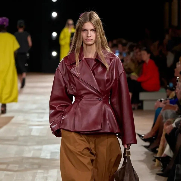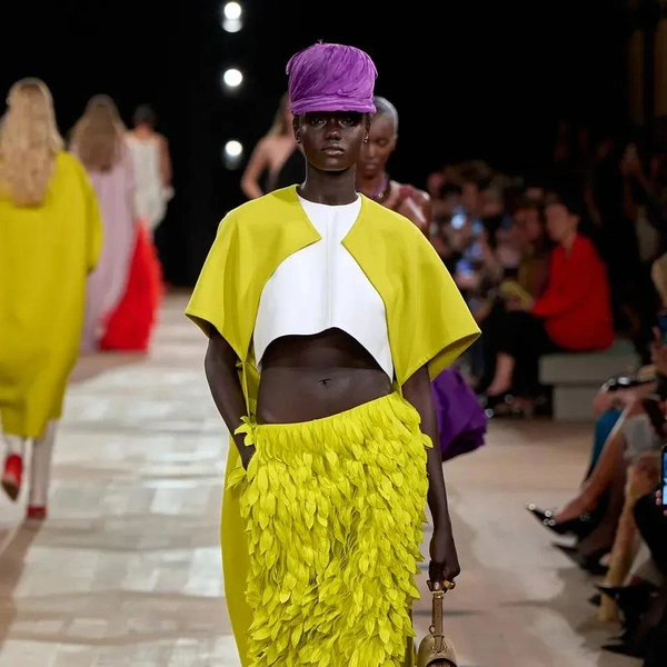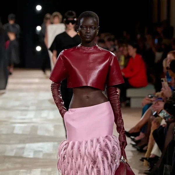 Далее следовала серия образов, объединенных идеей «архитектуры движения»: юбки-баллоны, A-платья, пальто-коконы и драпировки. Среди них — плащи-трапеции, туники поверх узких брюк, скульптурные кожаные топы, юбки с перьями, вечерние платья с асимметричными драпировками и платья-русалки с мерцающими оборками. Много внимания уделялось фактуре: бархат, органза, глянцевая кожа, ткань с эффектом меха. Газар — плотная ткань, очень любимая самим Баленсиагой, — использовался в сочетании с шелком и шерстью, создавая ощущение структуры без лишней тяжести. А вот цветовая палитра — уже фирменный прием Пиччоли: насыщенные зеленый, пурпурный, красный и розовый оттенки заменили избыточный декор и сложный крой, превратив цвет в главного героя подиума.