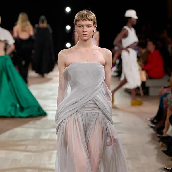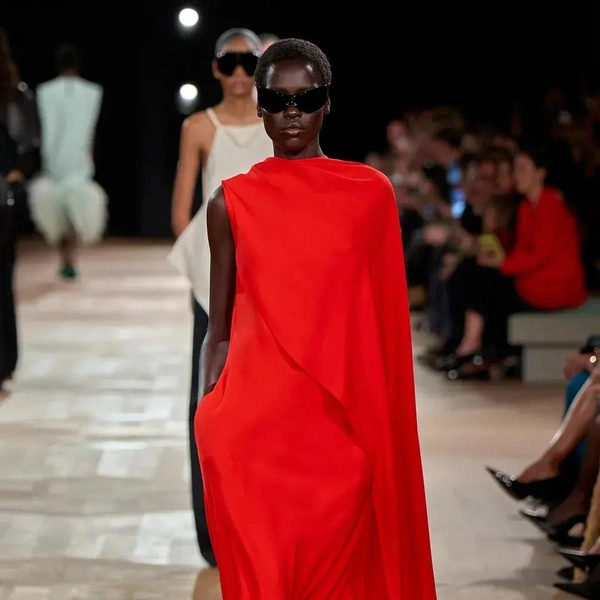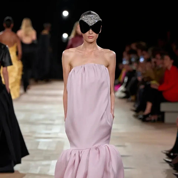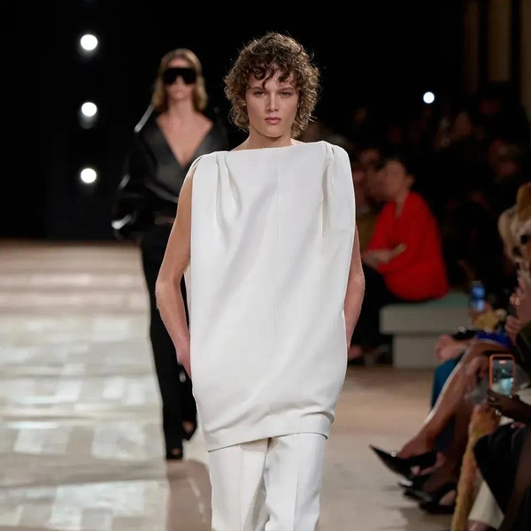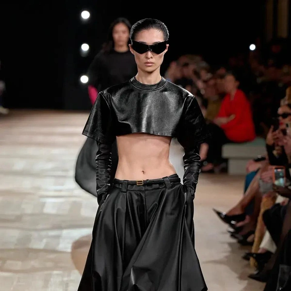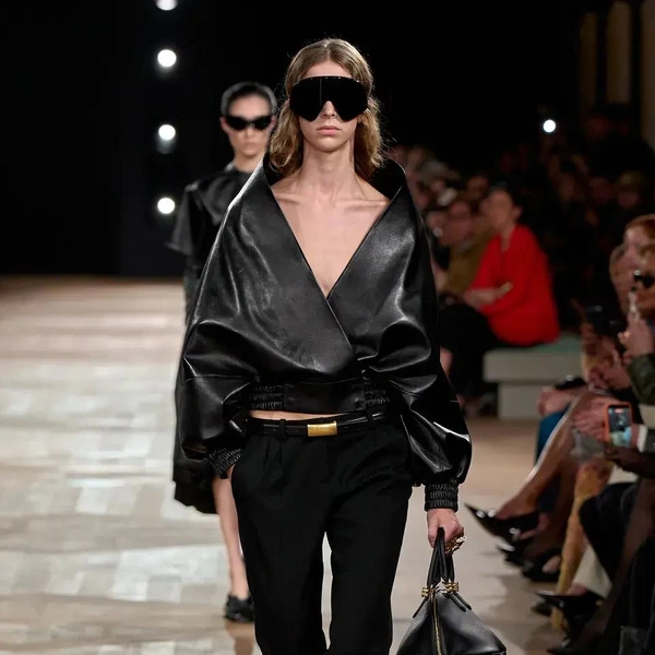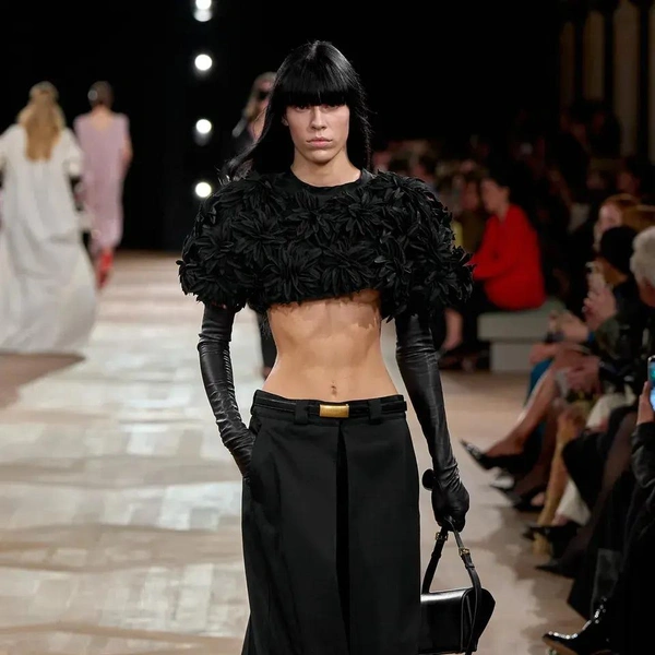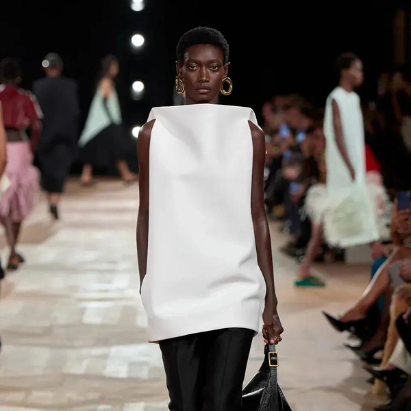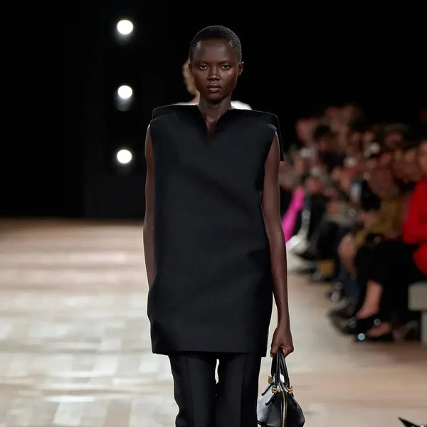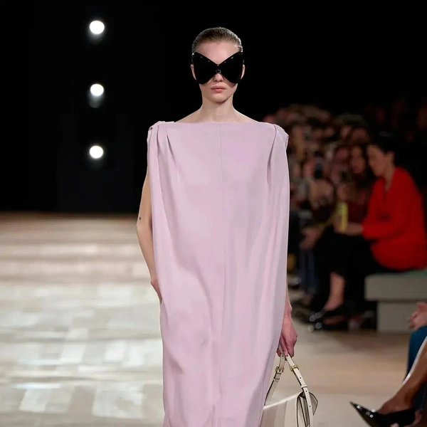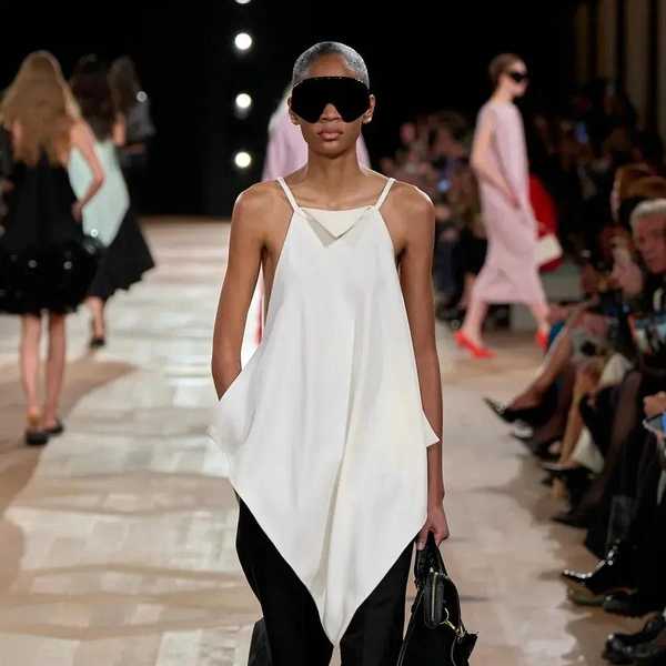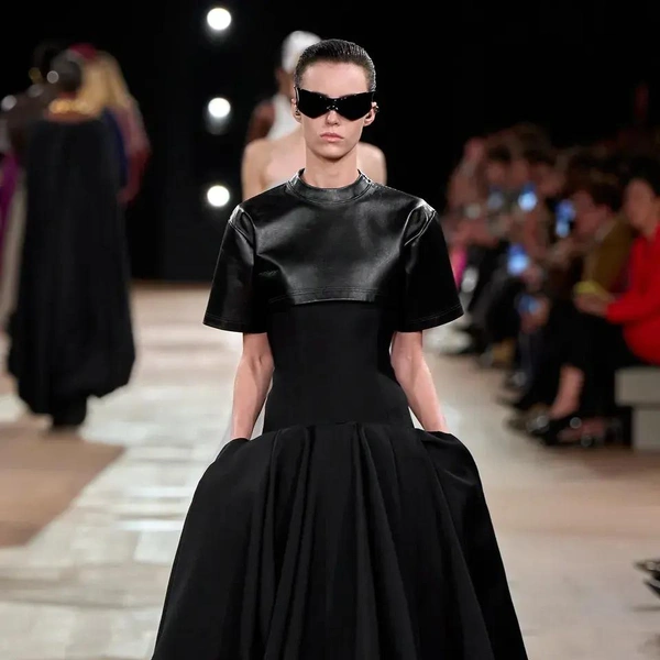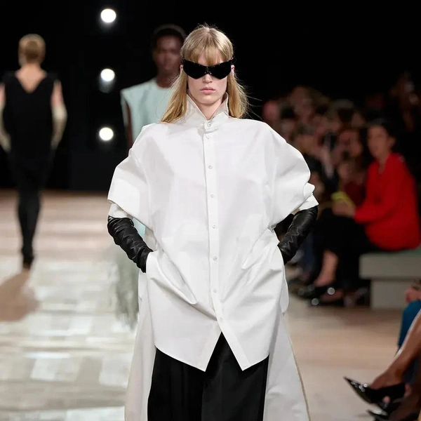 Первый образ на подиуме стал оммажем архивному платью Баленсиаги 1957 года — легендарному Sack Dress, силуэту, который освободил женщину от жестких корсетов эпохи Dior New Look. (Камень в огород соседнего конгломерата LVMH?) Пиччоли интерпретировал эту модель в виде черного вечернего платья с V-образным вырезом, белыми перчатками до локтя и гигантскими солнцезащитными очками — реверанс Демне и его любви к гиперболе.