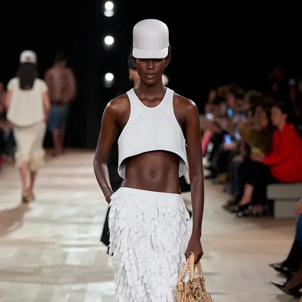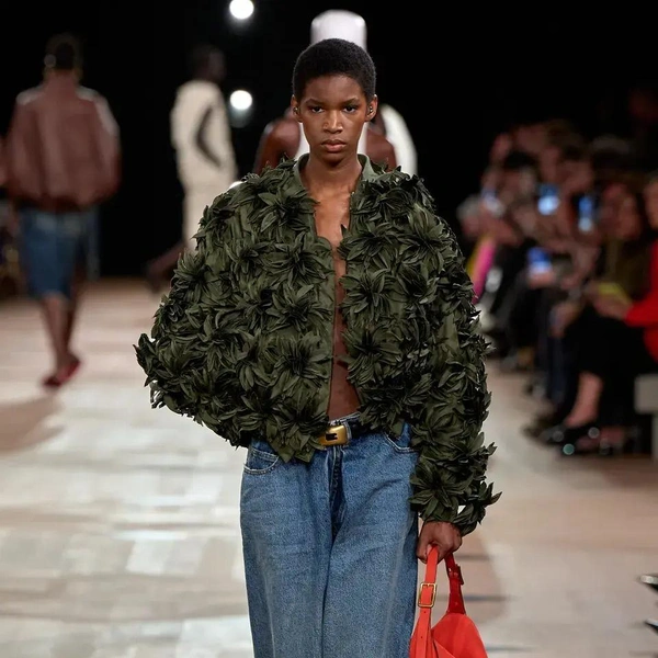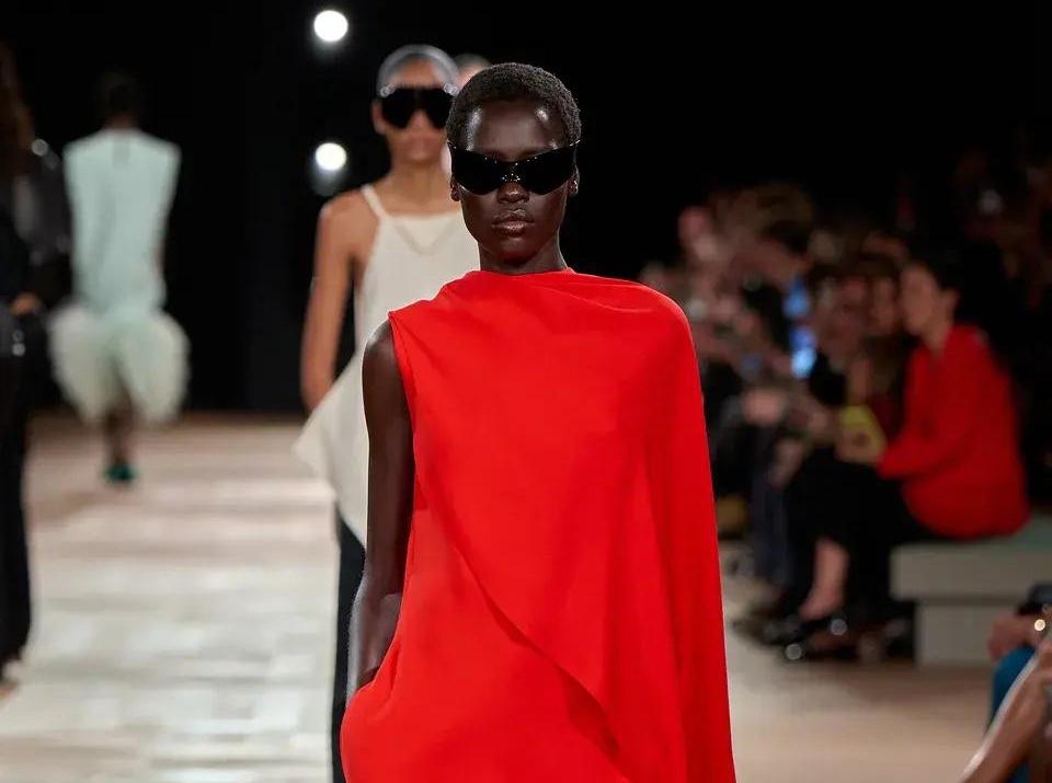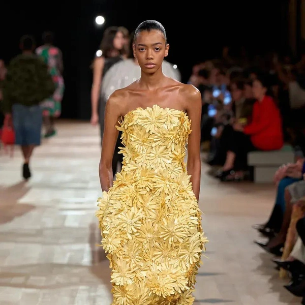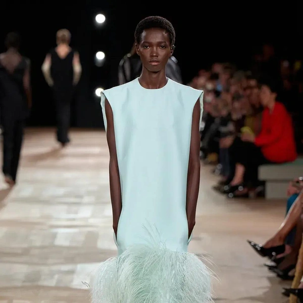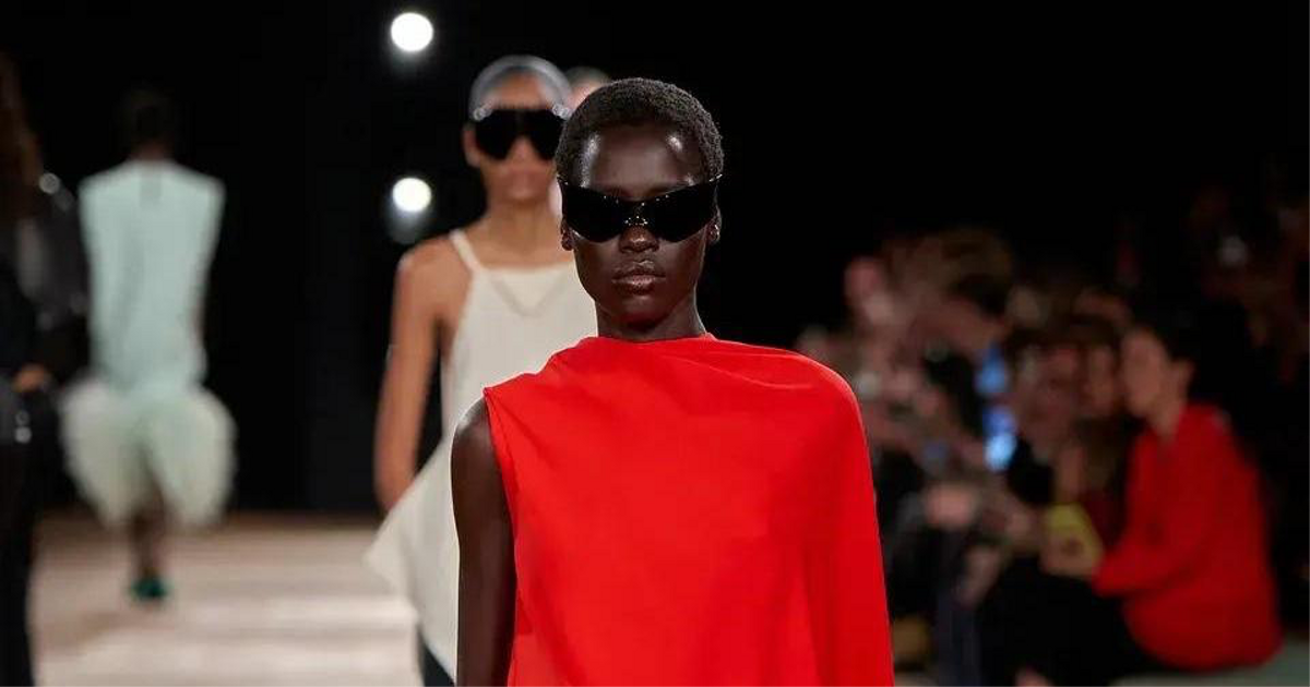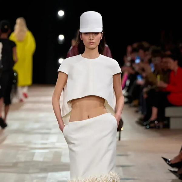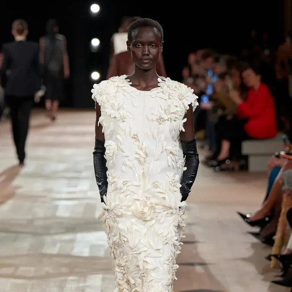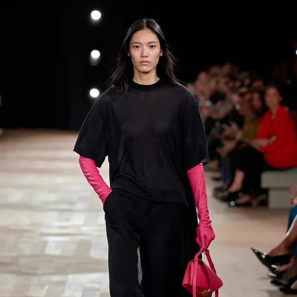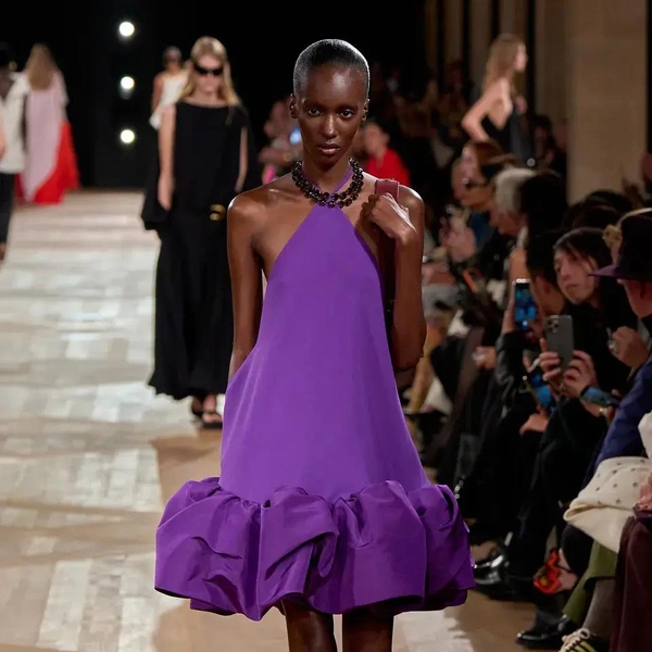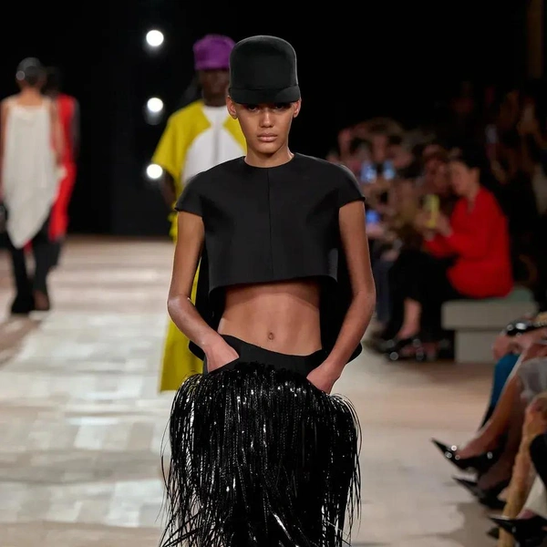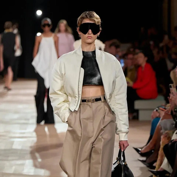 Первый образ на подиуме стал оммажем архивному платью Баленсиаги 1957 года — легендарному Sack Dress, силуэту, который освободил женщину от жестких корсетов эпохи Dior New Look. (Камень в огород соседнего конгломерата LVMH?) Пиччоли интерпретировал эту модель в виде черного вечернего платья с V-образным вырезом, белыми перчатками до локтя и гигантскими солнцезащитными очками — реверанс Демне и его любви к гиперболе.