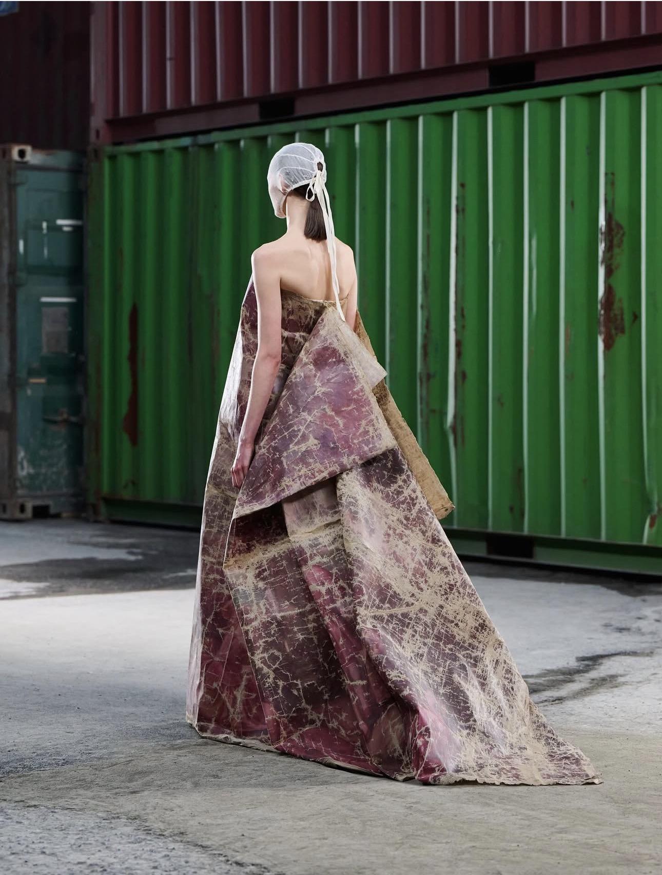 Призраки прошлого. На протяжении шоу мы увидели несколько образов, продолжающую традицию «призрачных» платьев из первой кутюрной коллекции Гленна Мартенс. Они чисти абсолютным хитом красных дорожек. На этот раз ткани остались такими же невесомыми, а вот жесткие и жестокие корсеты из конструкции убрали. Новый виток gost-dresses — драпировка, закрепленная таким образом, будто застывшая на ветру