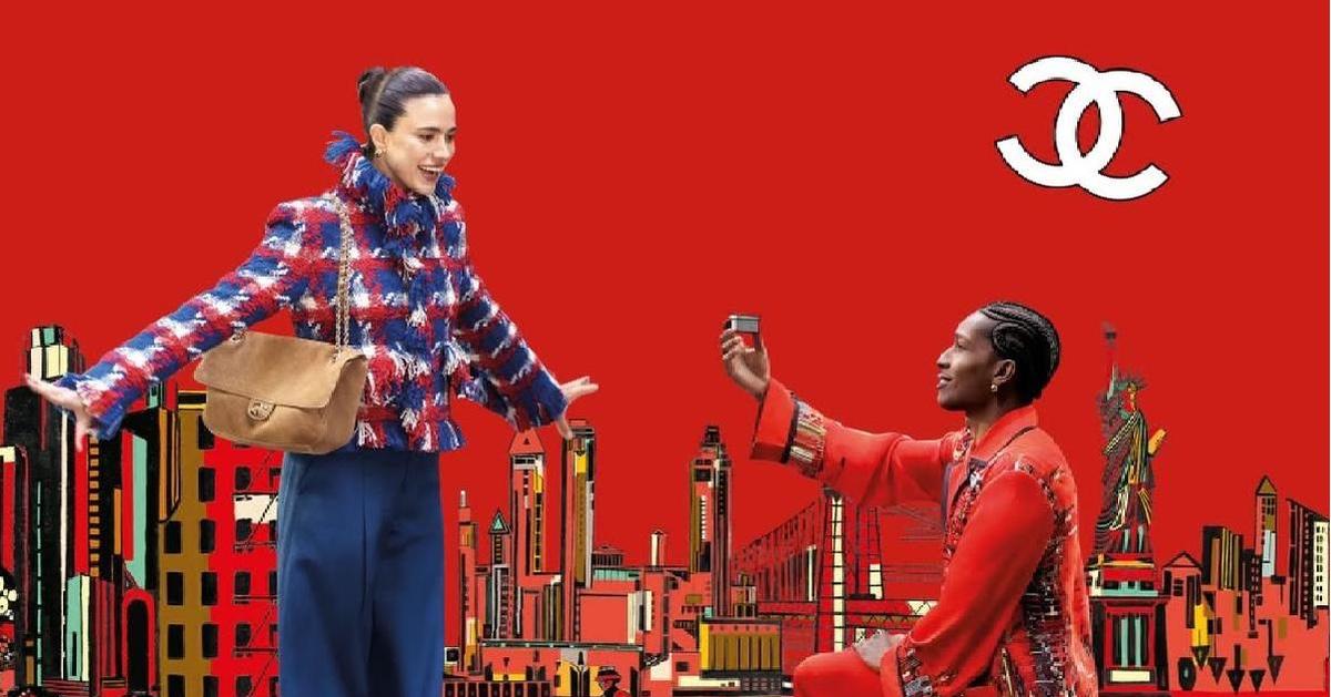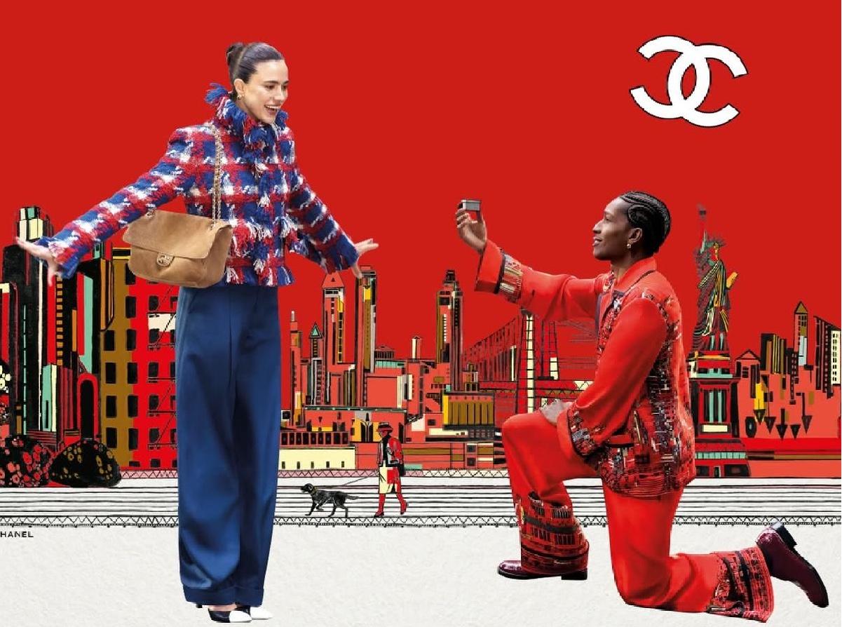 За несколько дней до шоу Chanel представили очаровательную короткометражку, снятую Мишелем Гондри. В ней новый амбассадор бренда ASAP Rocky делал предложение экранной возлюбленной Маргарет Куэлли, которая ехала в том самом метро. Прямой намек не только на локацию, но и на то, что вся коллекция будет построена вокруг кинематографа: от Дайан Китон до Великого Гэтсби. Другие источники вдохновения: газетная журналистка 1970-х, бизнесвумен 1980-х, героини, которых сам Блази встречал, когда сам ездил на метро, работая в Нью-Йорке для Calvin Klein и Ralf Simons. Он вспоминал даже уличного «Супермена», которого однажды увидел в поезде Times Square — этот силуэт позже перекликнулся с образом «Кларка Кента» в коллекции: под клетчатым пиджаком выглядывал графичный свитер с синим, красным и желтым мотивом.