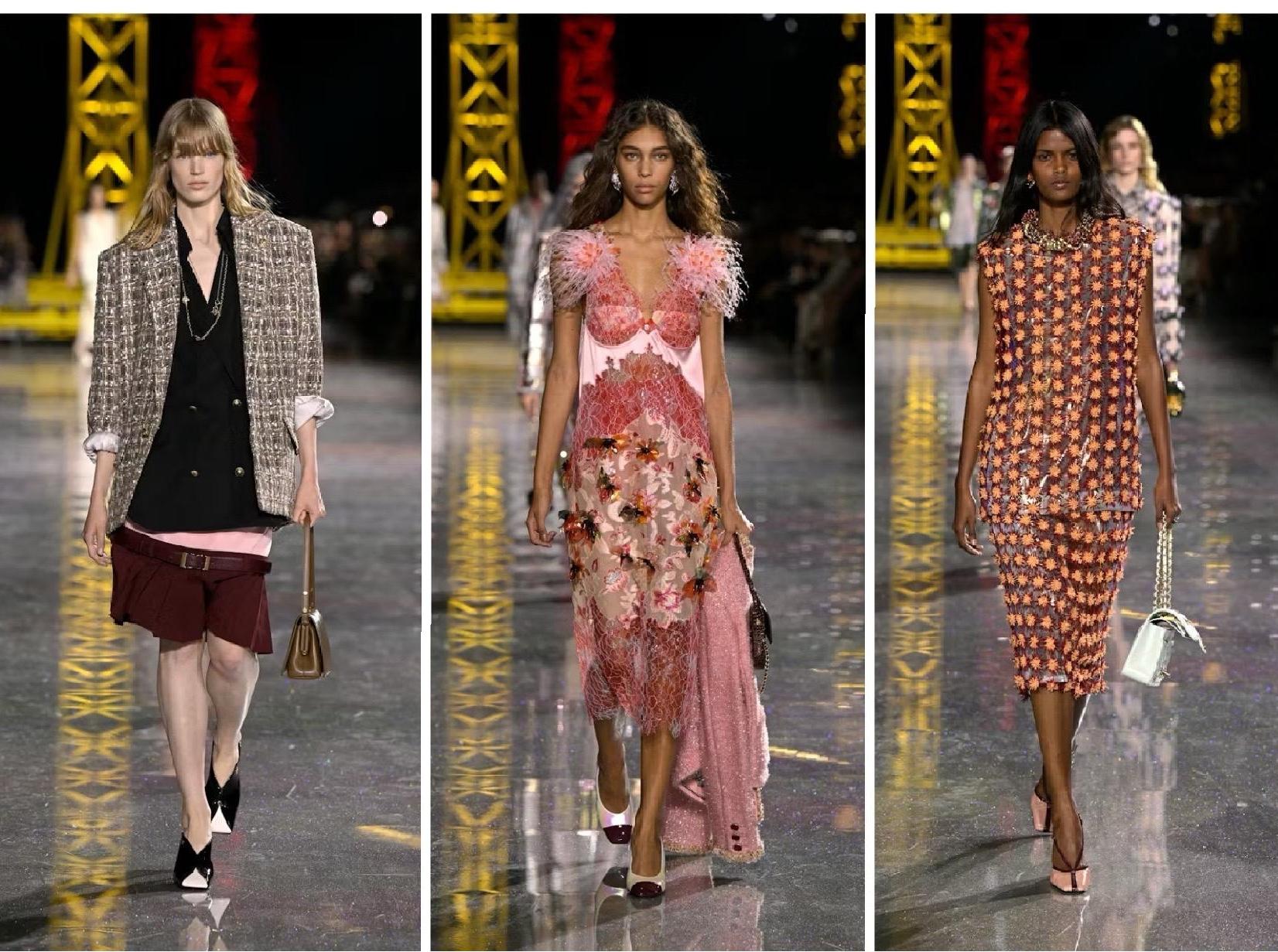 Ткани вышли далеко за пределы классического твида — рубчатый трикотаж, сложные переплетения с люрексом, силиконом и газом. Длина юбок не подчинялась единой логике: одни заканчивались чуть ниже колена, другие опускались значительно ниже, а заниженные талии в духе 1920-х уравновешивались поясами, сидящими на бедрах — уже из совсем другого десятилетия. Женщина, которая раньше ходила на светские ланчи, сбросила кокон. Теперь она настоящая!