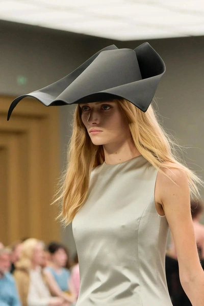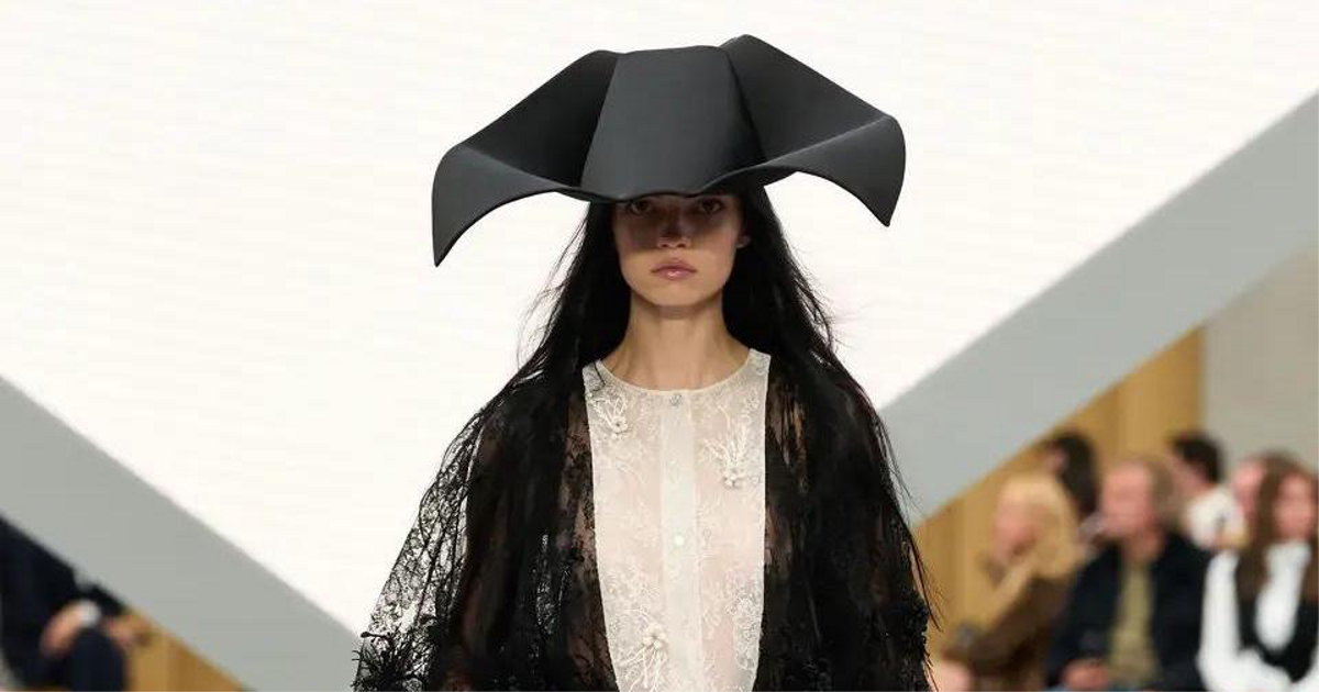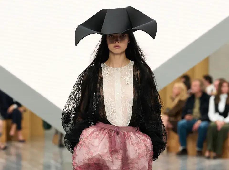 Эти шляпы не были декоративным дополнением к нарядам. Они работали как архитектурный акцент, подчеркивая игру объемов. В концепции Джонатана Андерсона треуголки стали символом того, что коллекция строится на противоречиях: прошлое встречается с настоящим, классика — с авангардом, а воспоминания — с разрушением.