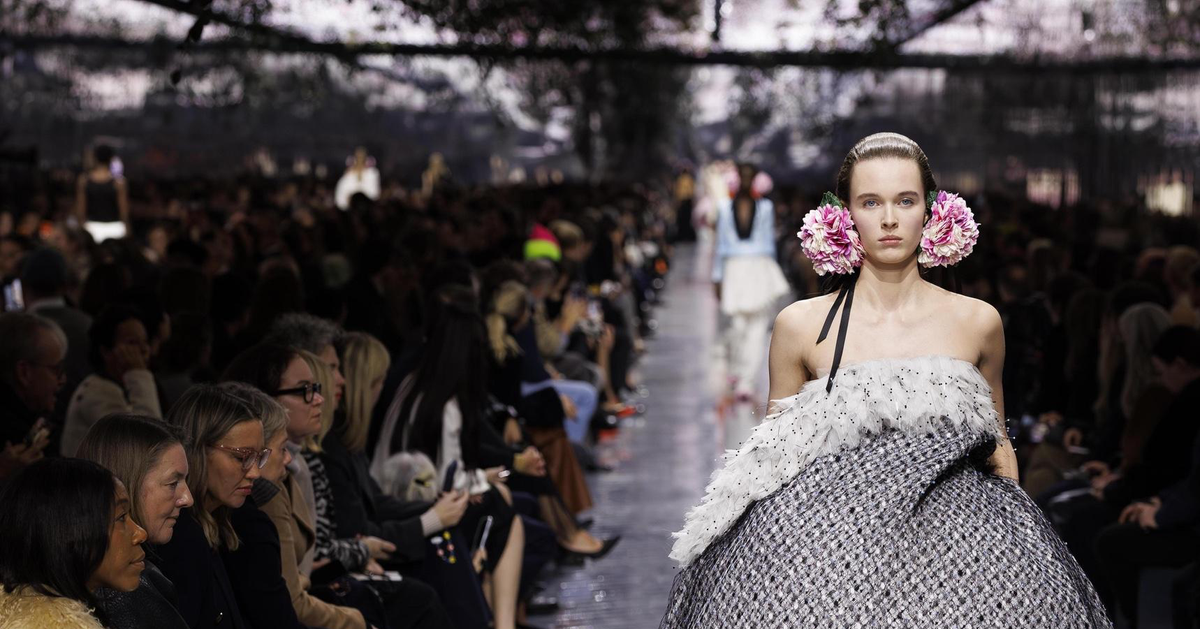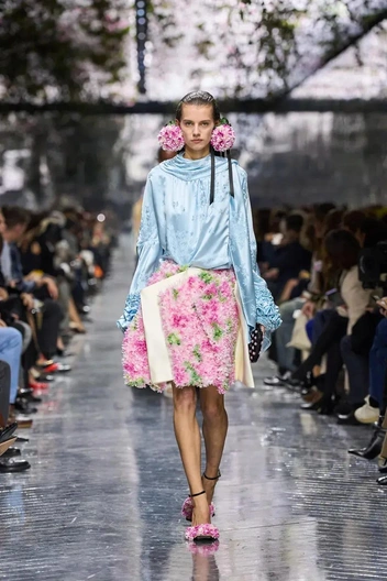 Пространство показа напоминало перевернутый сад. Над головами гостей раскинулся потолок, усыпанный цикламенами, отраженными в зеркалах до бесконечности. Этот эффект создавал ощущение погружения внутрь цветка, внутрь самой идеи Dior. По мере развития шоу цветы буквально расцветали на платьях, серьгах и обуви, превращаясь из декоративного элемента в полноценный конструктивный прием.