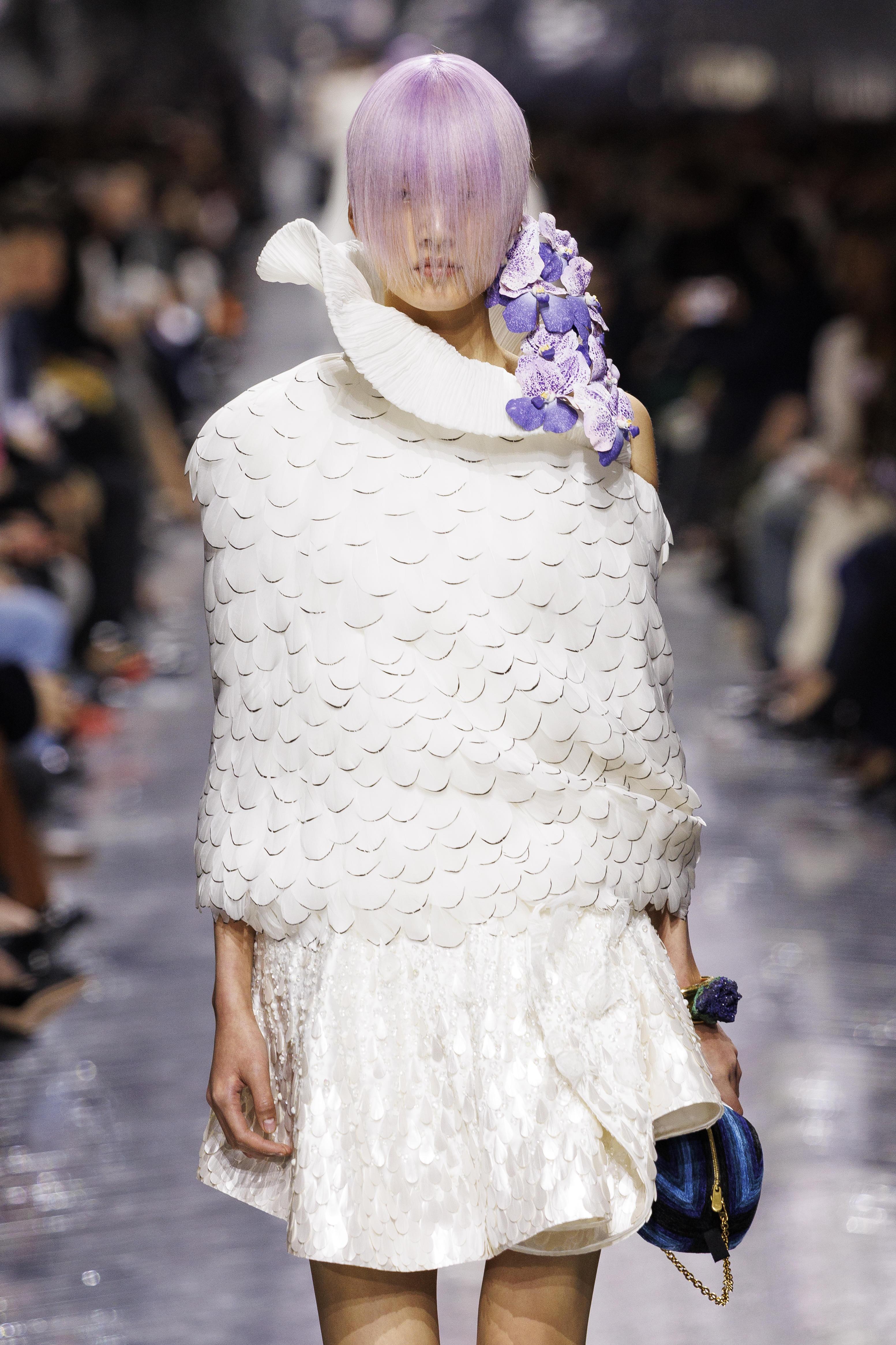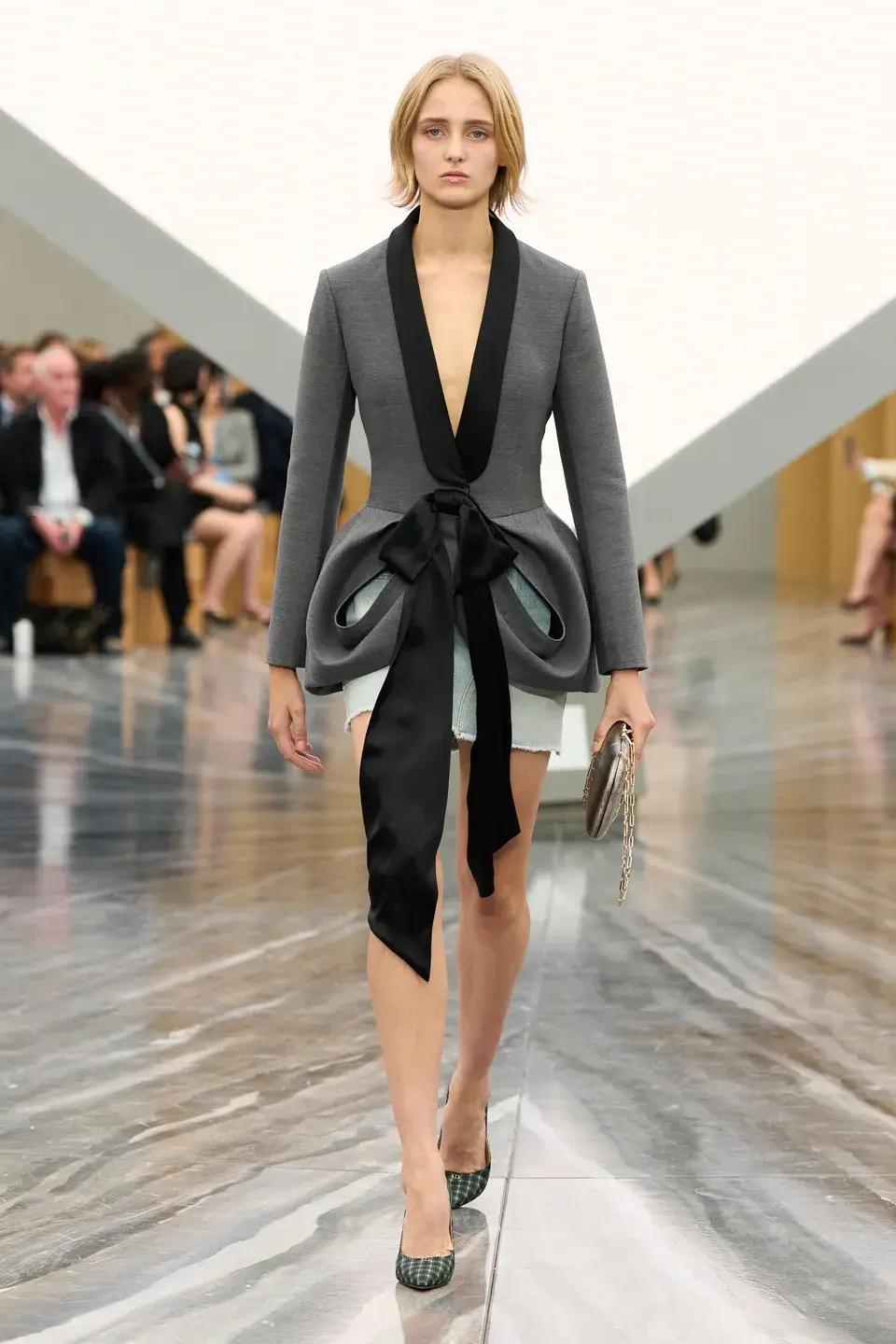 Вся коллекция стала демонстрацией исключительного мастерства ателье Dior. Драпировки из шелка, вручную заложенные складка за складкой на платье оттенка клементина, объемные топы из технического трикотажа, напоминающие воздушные пузыри, асимметричные юбки, скрученные шерстяные и шелковые свитера в сочетании с юбками, расшитыми перьями, вырезанными словно чешуя. Особое место заняло бюстье Cyclamen, полностью расшитое шелковыми лепестками и потребовавшее сотни часов ручной работы. Этот образ стал визуальным рифмованием с платьем Miss Dior 1949 года.