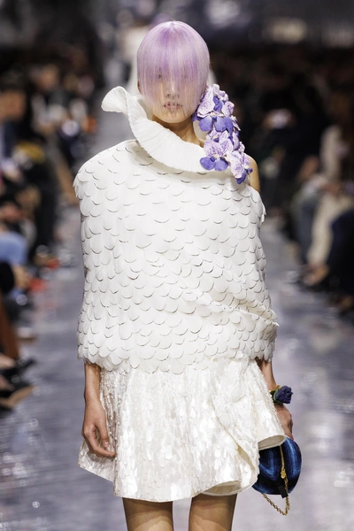 Давнее увлечение Джонатана Андерсона керамикой привело к сотрудничеству с художницей Магдаленой Одундо. Ее скульптуры с округлыми, антропоморфными формами стали отправной точкой для работы с пропорциями тела. Эти влияния проявились в объемных плиссированных платьях, открывших показ, и в колоколообразных силуэтах, напоминающих увеличенные ландыши, — любимый цветок Кристиана Диора.