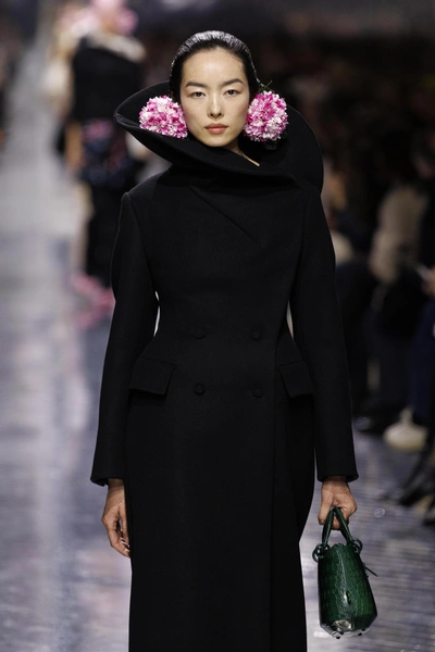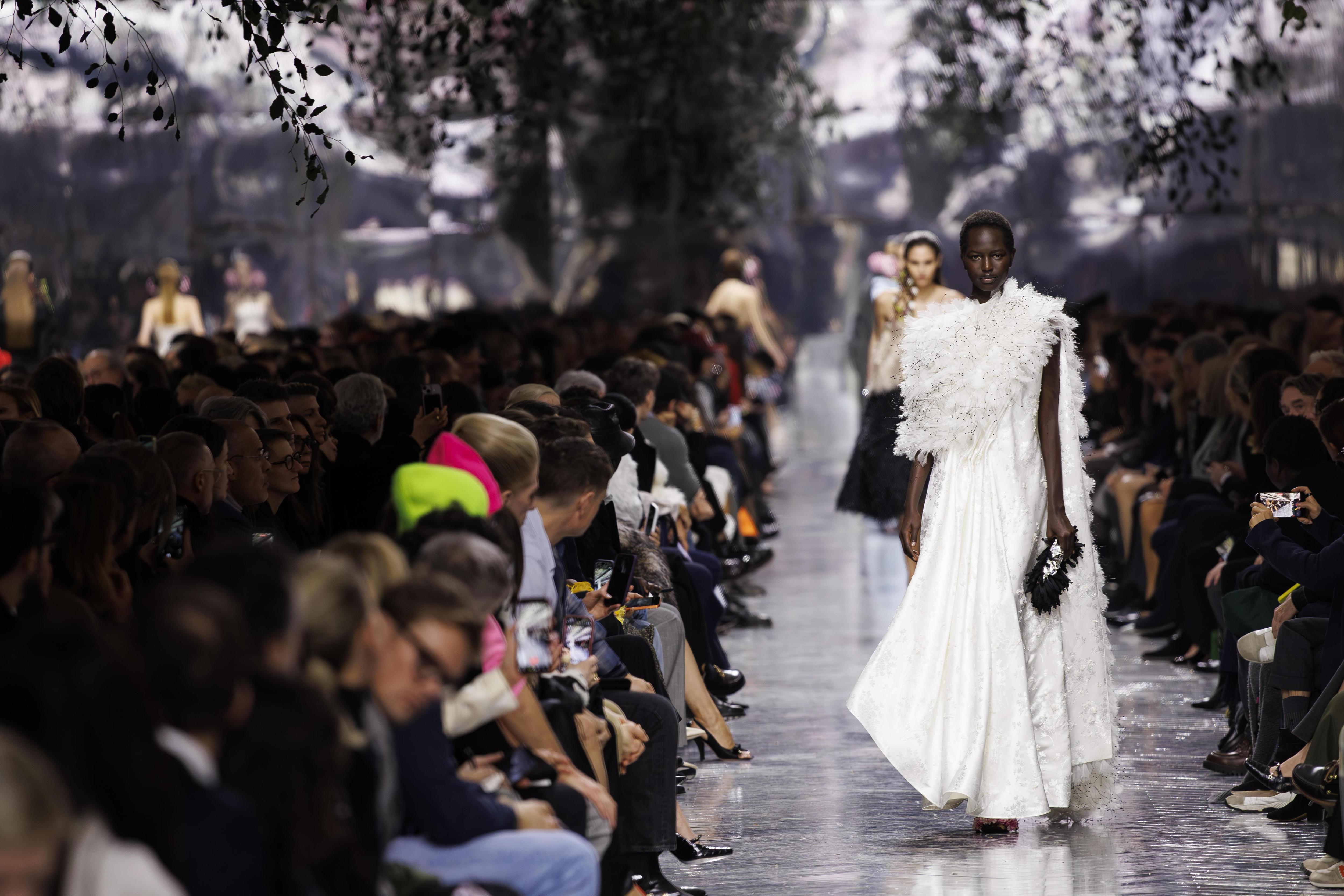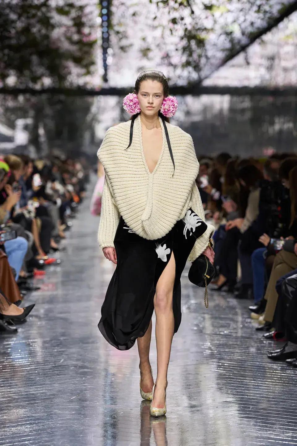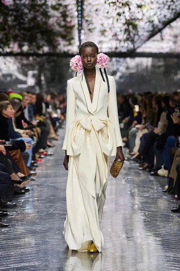 Сейчас уже кажется очевидным, что после своего назначения креативным директором Dior Джонатан Андерсон работал над двумя весенними коллекциями — кутюром и pret-a-porter — одновременно и параллельно. И в дебютном шоу для бренда было множество спойлеров того, что мы увидели в дальнейшем на кутюре. Как будто, нить повествования теперь будет тянутся из одного шоу в другое. Это касается и более масштабных версий платьев с косой драпировкой; и лениво завязанных бантов; и, главное, декоративных «пучков» гортензий. В первой коллекции они вырастали из подолов пары платьев, а на кутюре — появились повсеместно.