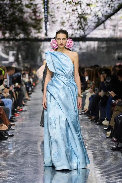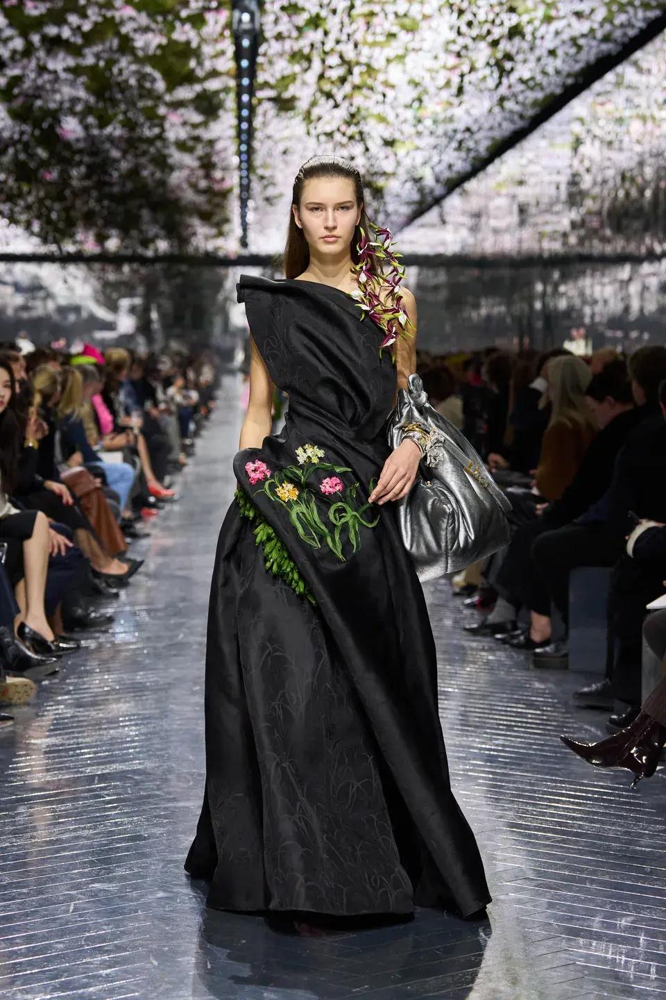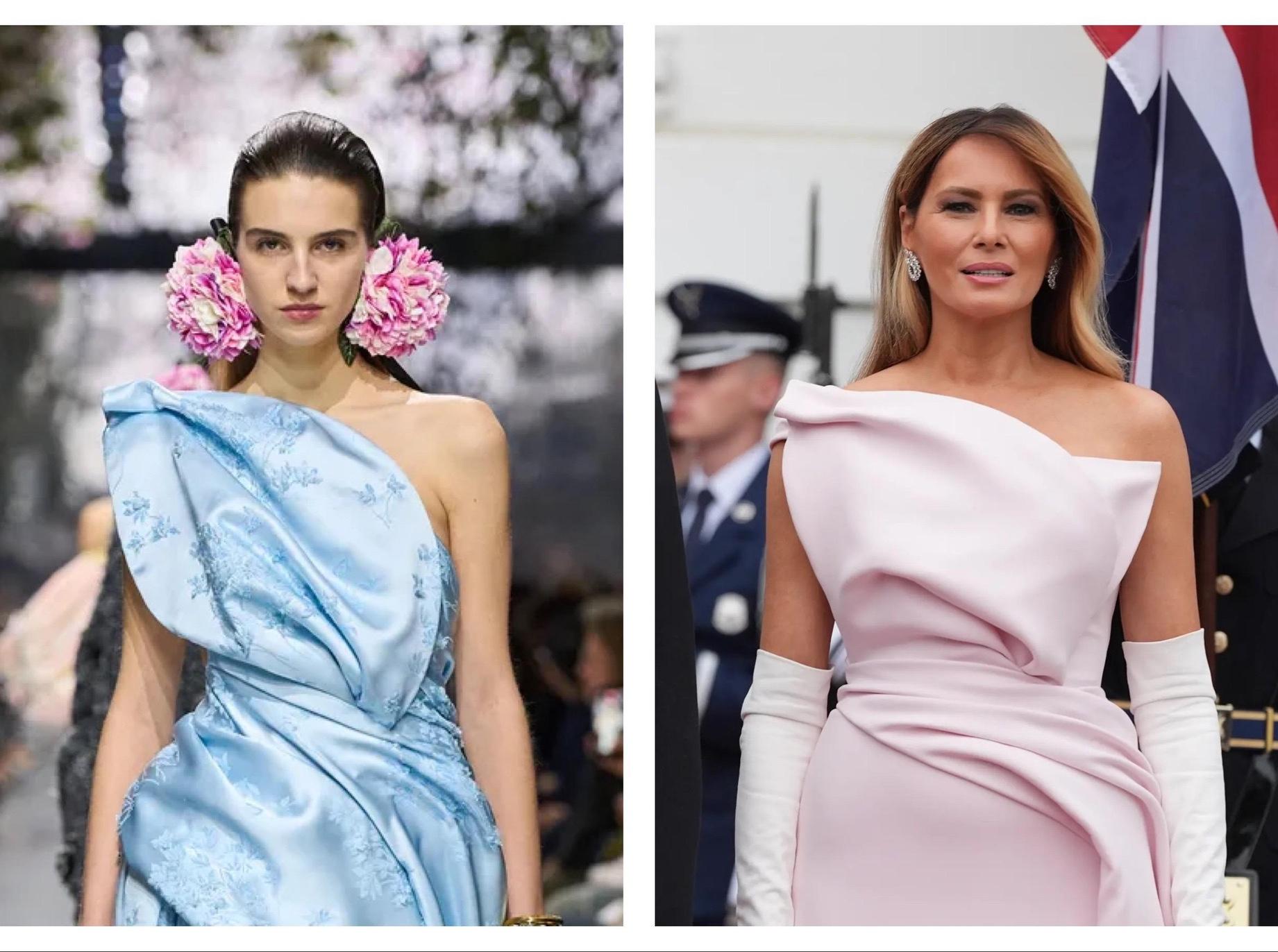 Платье относится к дебютной кутюрной коллекции Джонатана Андерсона для Dior, хотя идентичной модели на подиуме мы прошлым летом не видели. Узнаваемая деталь в персонализированном образе Мелании — драпировка, напоминающая слегка скрученный лепесток цветка.