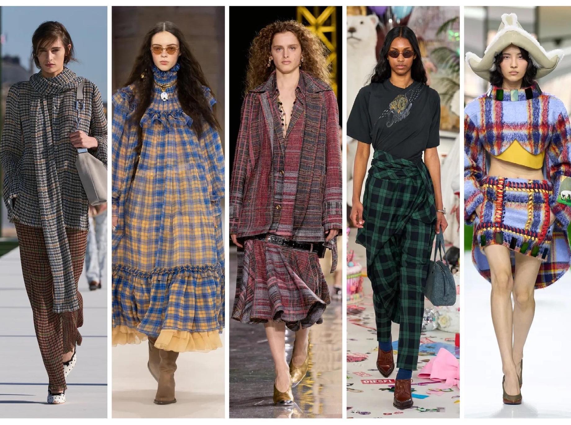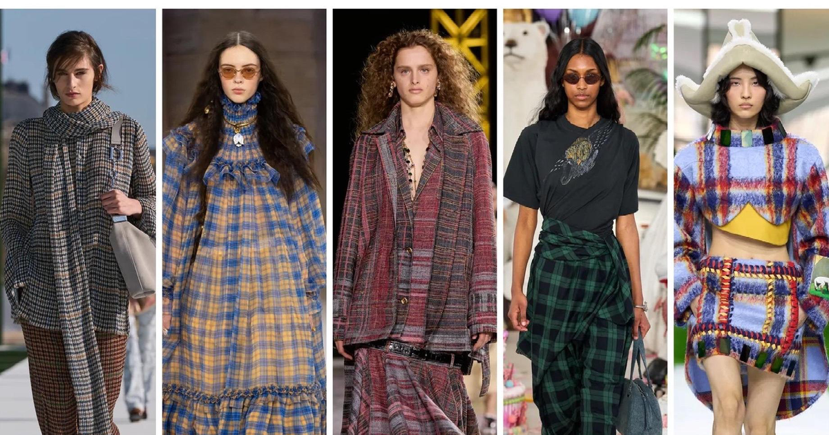 Это и понятно. Клетка — это удобный, но отнюдь не банальный инструмент — принт достаточно узнаваемый и понятный в работе, но при этом достаточно гибкий, чтобы каждый Дом мог сказать и сделать в нем что-то свое. Louis Vuitton подошел к теме с максималистским размахом: клетки смешивались, накладывались друг на друга, спорили за внимание — и в итоге рождали насыщенную визуальную драматургию. Совсем иначе прочитала тот же мотив Чемена Камали в Chloe: тартан лег на многоярусную юбку со свободным, почти богемным силуэтом, превратив архаичный шотландский узор в нечто воздушное и современное. Андреас Кронталер для Vivienne Westwood, как всегда, остался верен британскому тартану в верхней одежде — живая традиция, которую марка продолжает переосмыслять из сезона в сезон. От классической шашечки до мягкого гингема — принт, который умеет быть одновременно выглядеть консервативным и радикальным, камерным и вездесущим, — и именно поэтому дизайнеры снова и снова к нему возвращаются.