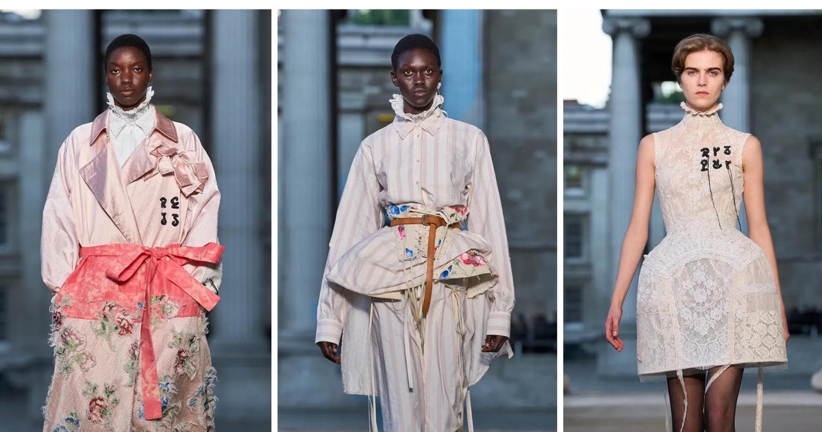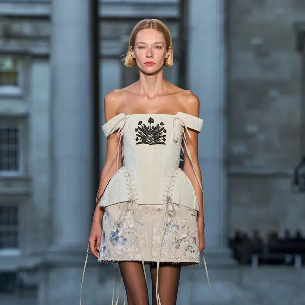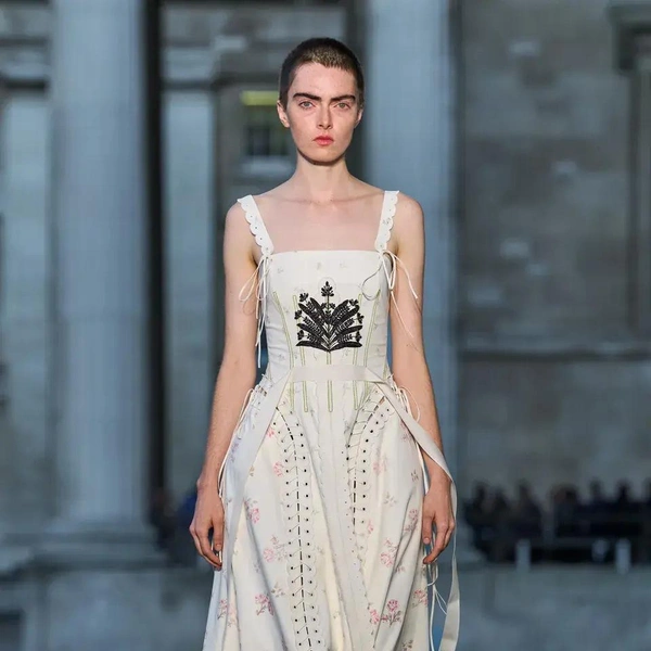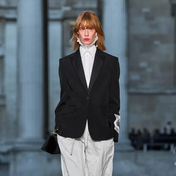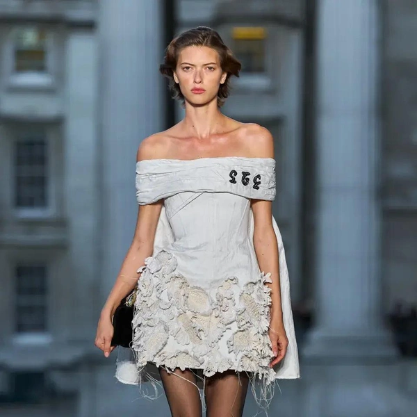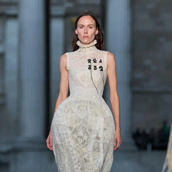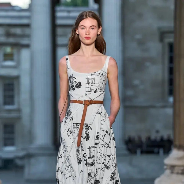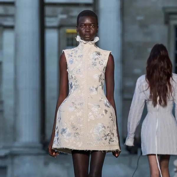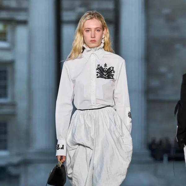 Итак, Erdem. Уже при первых выходах моделей на подиум мы поймали себя на ироничной мысли: «Кажется, мы знаем, куда отправилась Мария Грация Кьюри после ухода из Dior». Слишком уж явно корсетные платья-панье с акцентированными бедрами, ленты-шнуровки, викторианское кружево, высокие воротники с оборками и черно-белые графичные принты напоминали ее последние работы на посту французского Дома. На самом же деле канадско-турецкий дизайнер Эрдэм Моралиоглу, регулярно показывающий коллекции в календаре Лондонской недели моды, никуда не исчез. А сходство силуэтов и приемов объясняется общим источником вдохновения — стилем Марии-Антуанетты. (Возможно, это связано с выставкой о французской королеве, недавно открывшейся в Музее Виктории и Альберта, а возможно, всего лишь совпадение.)
