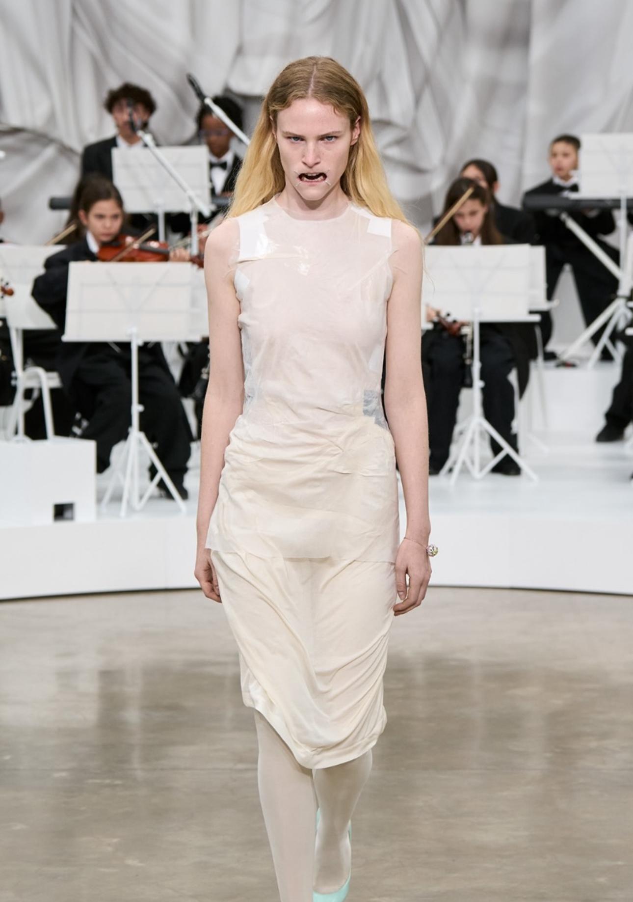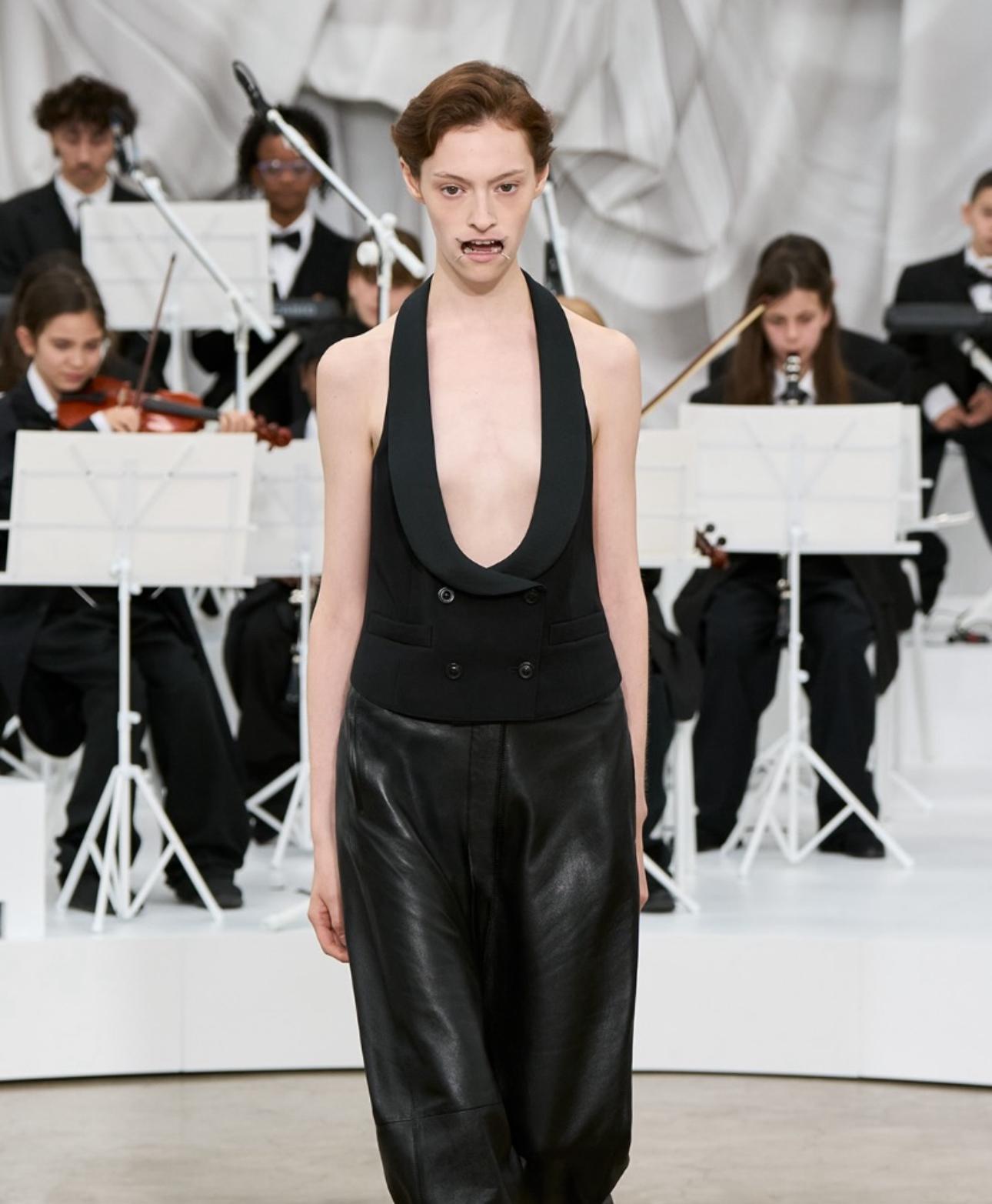 Если быть откровенными, одежду на показе даже сложно вспомнить и «пересказать». Все внимание взяли на себя два обстоятельства. Первое — симфонический оркестр детей, которые «баловались в Шостаковича». Второе — необычный вид моделей. В рот каждой модели были встроены металлические фиксаторы, которые удерживали губы в неестественном положении. Конструкции напоминали хирургические зажимы или стоматологические расширители, превращая выражение лиц в смесь немоты, зевоты и гримасы. Как будто перед нами кадры из хоррора с перекошенными от ужаса лицами. Этот образ мгновенно разошелся по соцсетям, породив волну комментариев о «самом жутком макияже сезона». Но при ближайшем рассмотрении оказалось, что фиксаторы несут не только эстетический шок, а концептуальный смысл.