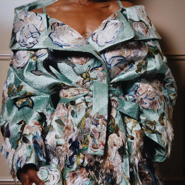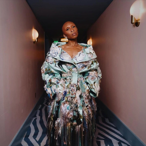 Икона стиля Синтия Эриво в Givenchy продолжила нежно-зеленую тему, но вывела ее в совершенно иную плоскость. Для вечера она выбрала не просто платье, а пальто с бахромой и принтом, вдохновленным картинами Ван Гога. Не образ, а настоящий концептуальный арт-шедевр. Сложная фактура, насыщенный цвет и художественная отсылка сделали ее выход особенно обсуждаемым. Платье с «масляными мазками» и сложной структурой ткани вновь подчеркнуло, какой фантастический и грамотный переход совершила Сара Бертон из Alexander McQueen в Givenchy. А Эриво в сотый раз подтвердила статус одной из самых смелых и вдумчивых звезд красной дорожки, выбирающей запоминающиеся, а не проходные решения.