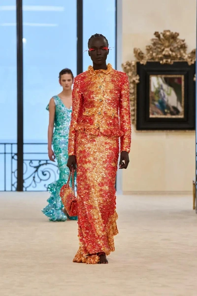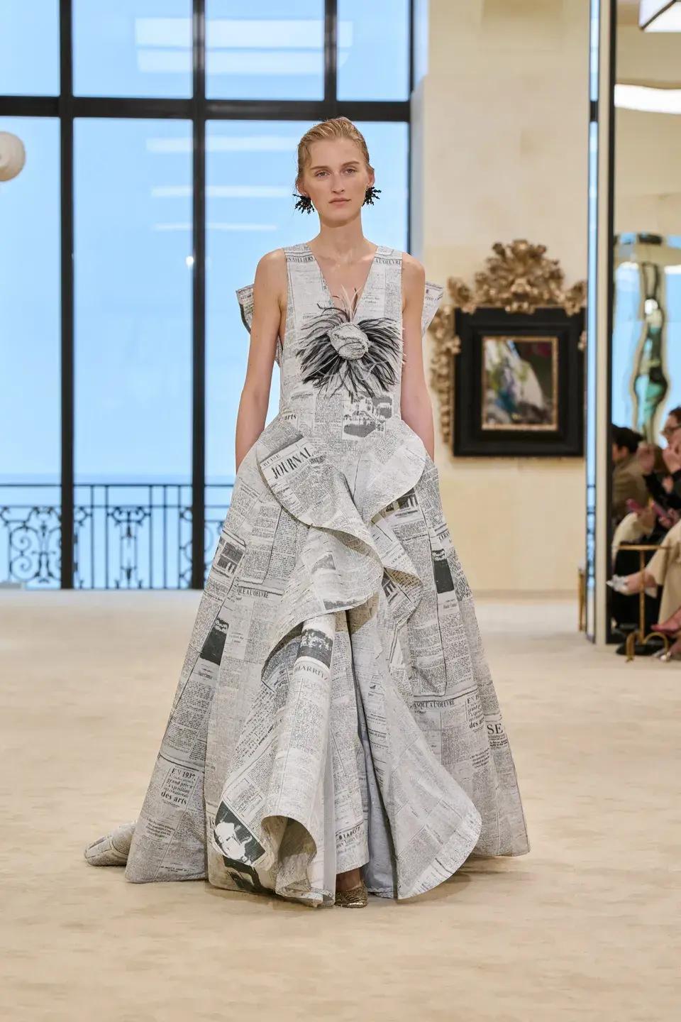 Впечатляет и вечерняя часть коллекции. Красное платье из замысловатого кружева, напоминающего переплетение кораллов. Многослойные черные рюши, доведенные до состояния почти абстрактного объема-медузы. Жидкие пайетки на оранжевом костюме и бирюзовом платье, напоминающим хвост русалочки. Почти в финале — бальный наряд с газетным принтом. Блази не скрывает своих источников вдохновения и перечисляет предшественников этой идеи: суфражистки, Скьяпарелли и Джон Гальяно для кутюрного Dior. Но тут же настаивает и на решающем «домашнем» факторе. Якобы судьбу этой модель предопределила цитата самой Габриель Шанель: «Я люблю читать газеты — как мужчины».