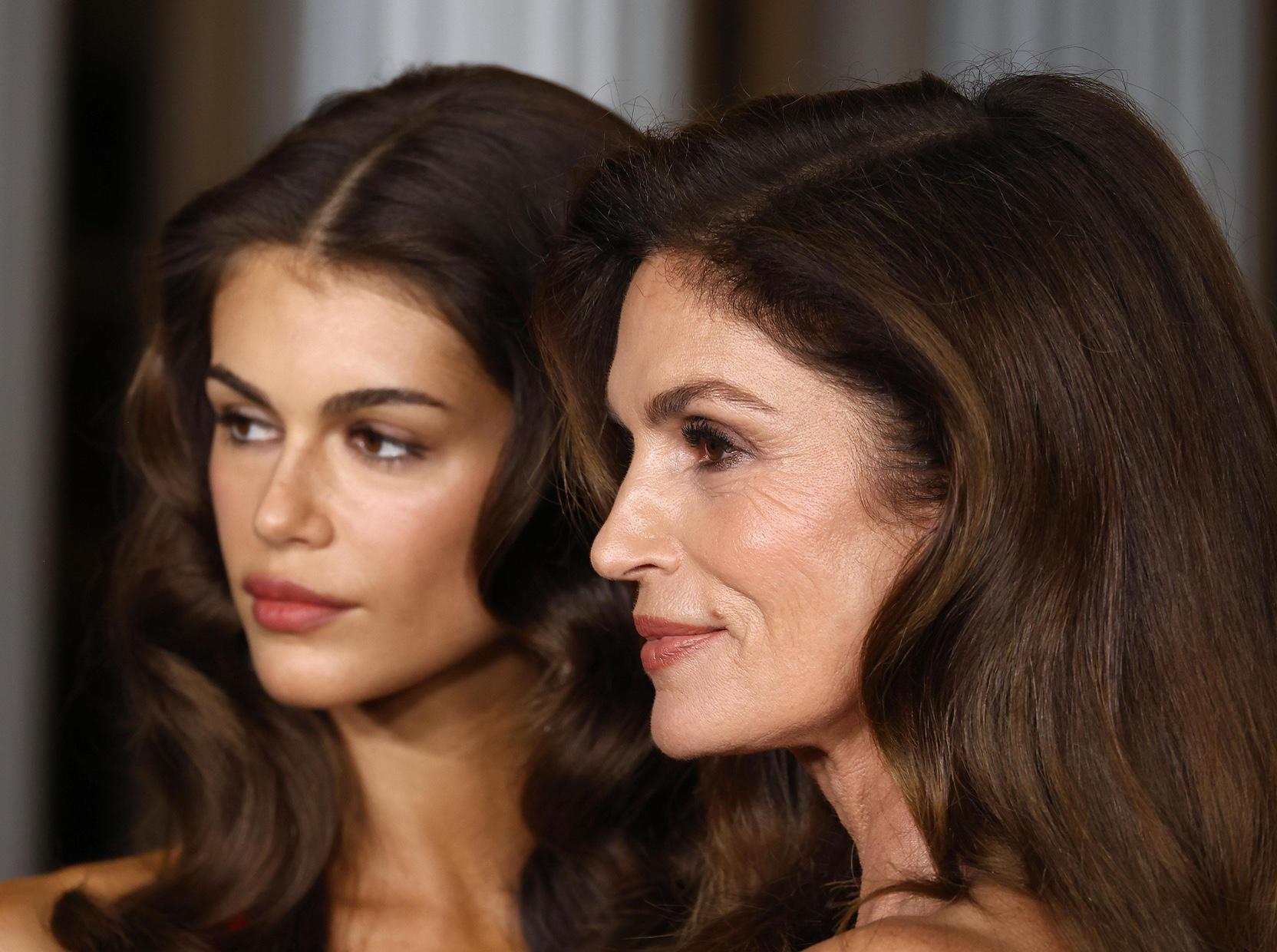 Синди и Кайя выглядели почти как зеркальное отражение друг друга. Обе выбрали укладки с мягкими локонами в духе старого Голливуда и боковой пробор, придающий образу особого шарма. Свет падал так, что их схожие черты лица казались еще выразительнее. Различить моделей можно было лишь по нарядам: Кайя предпочла насыщенно-красное платье в пол с глубоким вырезом, дополнив его лаконичным черным кольцом и нейтральным маникюром. Синди выбрала золотое платье с открытыми плечами, украшенное объемными цветочными аппликациями и тонкими кисточками. Макияж обеих был почти идентичным: акцент на сияющую кожу, мягкие тени и естественный оттенок губ, благодаря чему сходство Кроуфорд и Гербер казалось почти кинематографическим.