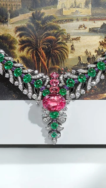 Камни подобраны и расставлены с точностью классиков-живописцев: фиолетовые сапфиры чередуются с кабошонами из изумруда, инкрустации из оникса соседствуют с бриллиантами, багеты — с круглой огранкой. Каждый элемент существует не сам по себе, а как часть общей цветовой партитуры. Кажется, что колье «вьется» на коже, подобно растению, которое тянется к солнцу. Такого эффекта удалось достичь за счет кропотливой работы мастеров: на создание украшения ушло свыше 1200 часов труда ювелиров.