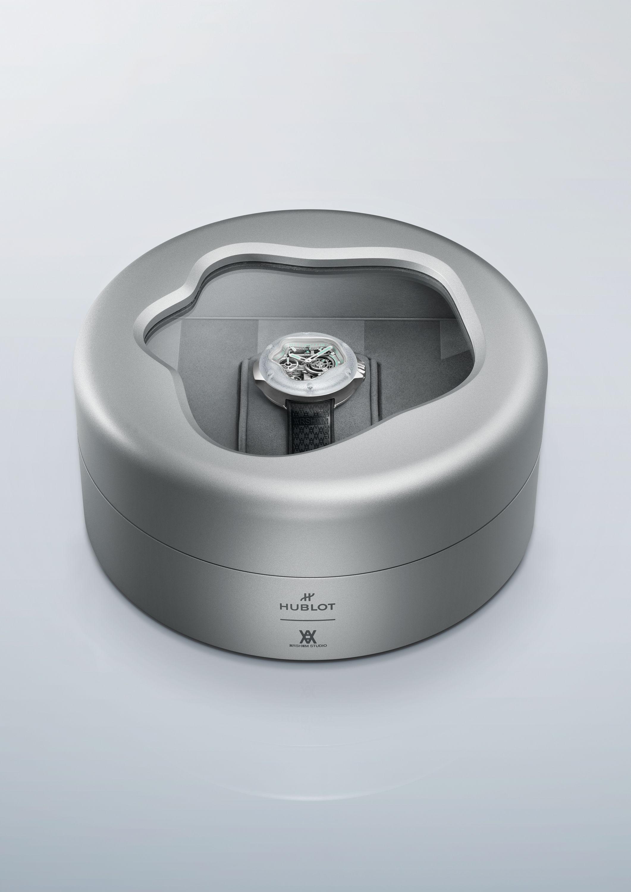 MP-17 Meca-10 Arsham Splash — компактные 42-миллиметровые часы с механизмом ручного завода Hublot Meca-10, с десятидневным запасом хода. Механизм полностью виден сквозь прозрачный циферблат и заднюю крышку из сапфирового стекла. Корпус выполнен из титана и матового сапфира, безель — из сапфирового стекла, а ремешок — из фирменного каучука. Такое сочетание соответствует философии Hublot Art of Fusion, где противоположные по свойствам материалы объединяются в единую конструкцию.