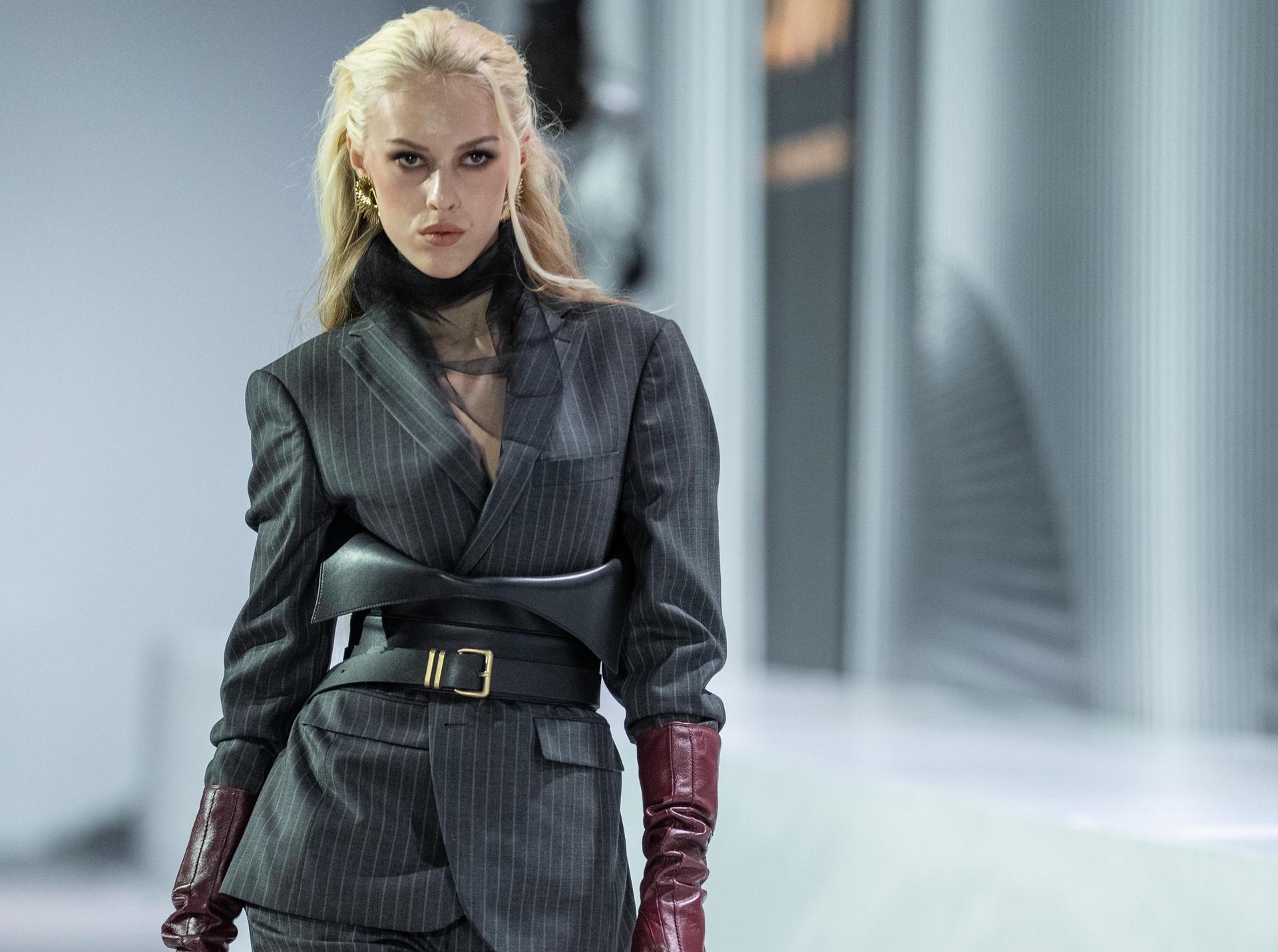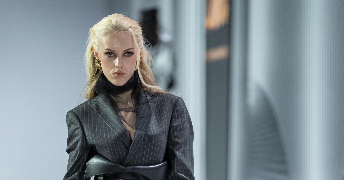 Свою новую коллекцию участница Kazakhstan Fashion Week 2026 Дина Марат назвала Silent Authority («Молчаливая власть»). И это один из наиболее последовательных и цельных шоу всей Недели с точки зрения концепции и исполнения. Стилистически идея — раскрыть современные понятие power dressing. Без агрессии и чрезмерной маскулинности, а более сдержанно и чувственно. Серый пиджак в тонкую полоску с широким ремнем-баской и бермудами до колена; мягкий красный блейзер с широкими брюками того же оттенка. Или костюмное мини-платье в сочетании с высокими красными перчатками (разноцветные перчатки вообще стали приметой стайлинга в новой коллекции DM by Dina Marat). Отсылка к 1960-м считывается через силуэт: структурные плечи, четкая талия, длина до колена. Дизайнер не подражает той эпохе, а адаптирует ее коды под современный гардероб уверенной в своей силе и амбициях женщины.