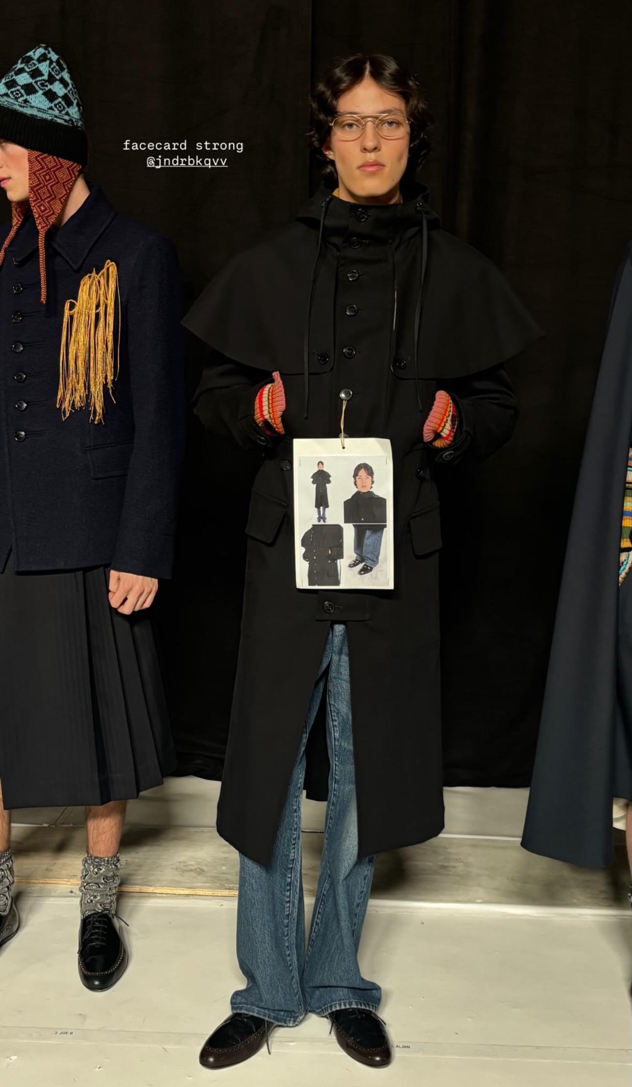 Новый день — новый Альжан. Следом за дебютом у Louis Vuitton Фаррелла Уильямса и показом Dior Men Джонатана Андерсона, Джандарбеков сделал модный хет-трик у эстета Dries Van Noten. Новую мужскую коллекцию осень-зима 2026 критики уже окрестили «самой взрослой» среди всех шоу нового креативного директора бренда Джулиана Клауснера. (Это четвертая коллекция с момента его назначения.) Альжану на подиуме достался образ с узким длинным пальто и денимом, непривычно было увидеть казахстанца в оригинальных «старомодных» очках. При этом вышел на подиум Альжан в первой пятерке, фактически открывая шоу.