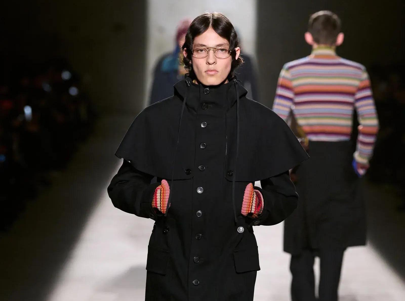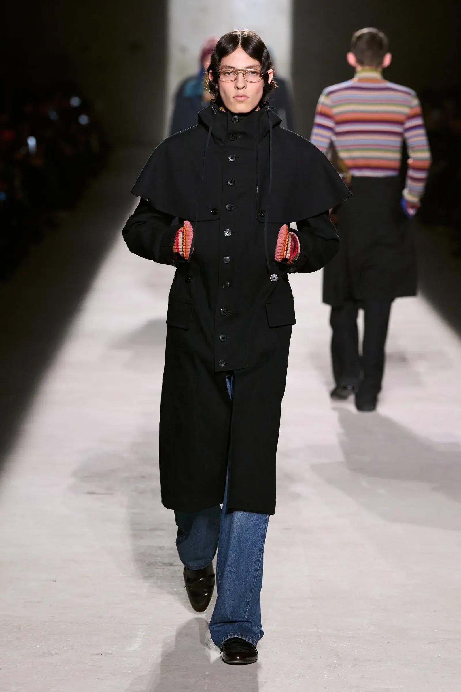 Мужская коллекция Dries Van Noten стала размышлением Клауснера о взрослении и формировании мужской идентичности. Дизайнер сделал ставку на трикотаж, многослойность и игру с пропорциями, соединяя академическую эстетику, килты и пэчворк с насыщенными цветами и узорами. Это модная фантазия «о пути от дома к самостоятельной жизни», где именно поиск себя, метод проб-ошибок-экспериментов становится главным стилевым приемом.